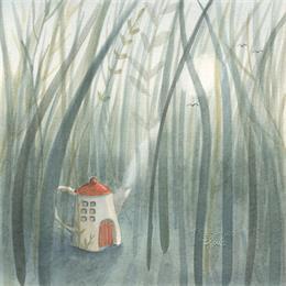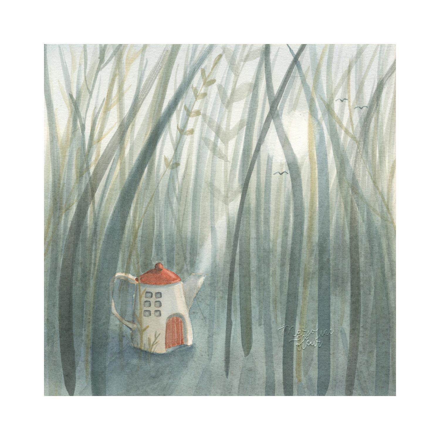 This unique and original contemporary artwork "Maison théière champs" on the subject of Landscapes has been created by the contemporary artist Marjoline Fleur.