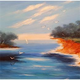 This unique and original contemporary artwork "Les roches rouges" on the subjects of Marine, Landscapes has been created by the contemporary artist Lyn.