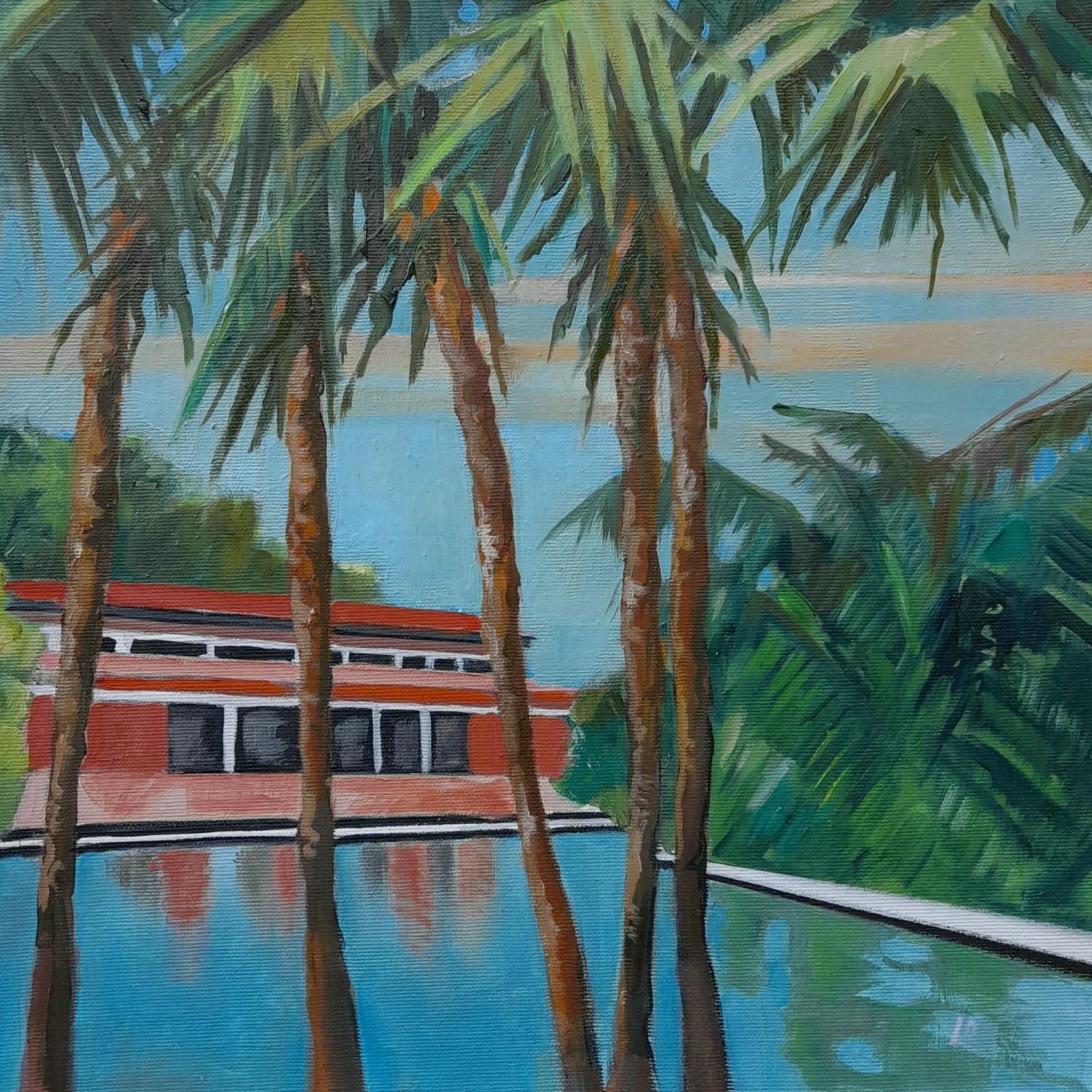 This unique and original contemporary artwork "Maison des îles le soir" on the subject of Marine has been created by the contemporary artist Lorene Perez.