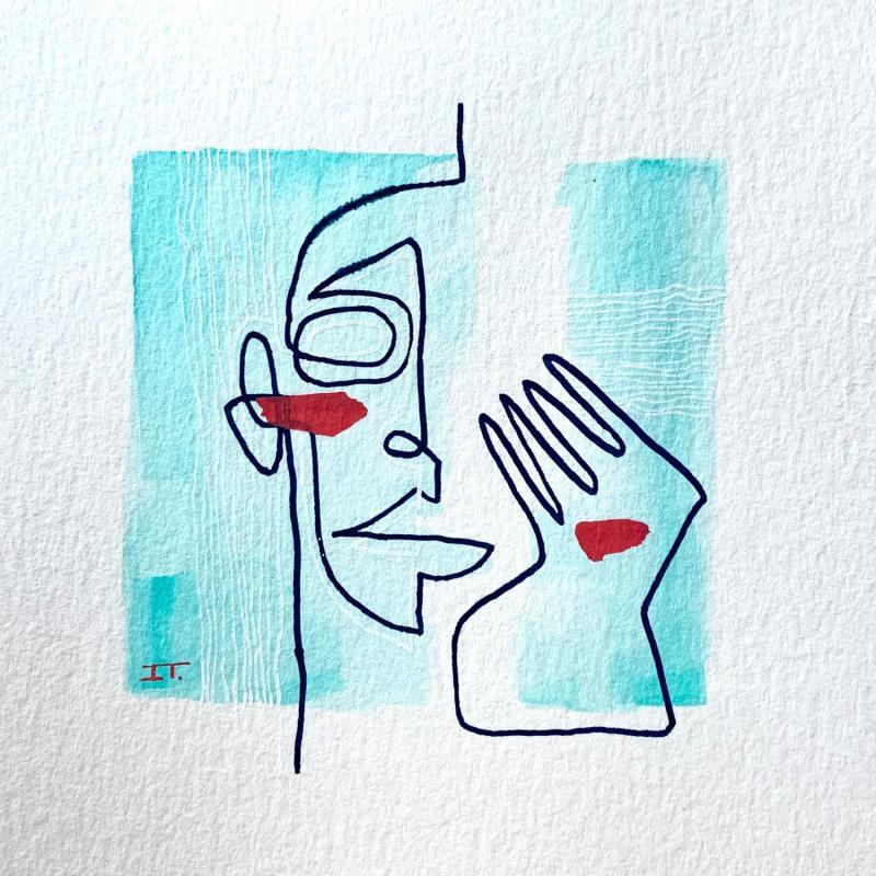 This unique work, with a delicate turquoise background and a few white lines as detail, the main image is a portrait touching the face with its left hand, the figure is made up of two figures in continuous lines and two red spots connecting them.