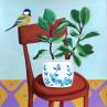 This unique and original contemporary artwork "Bird on a chair with plant" was created by contemporary artist Sally B.