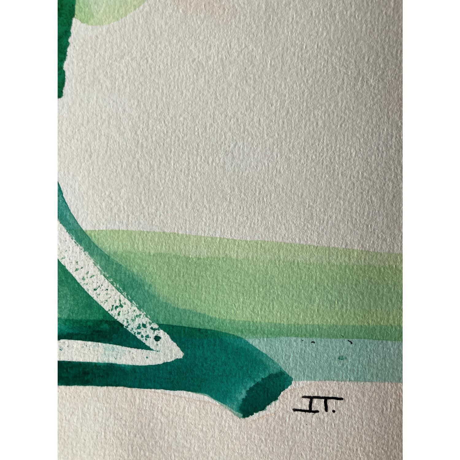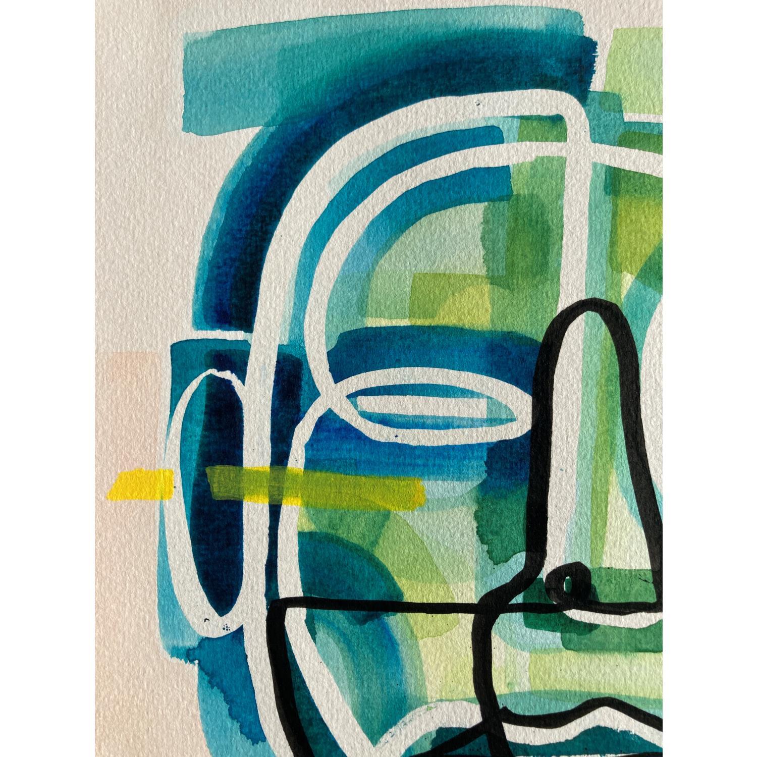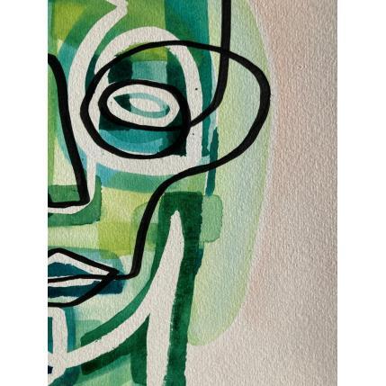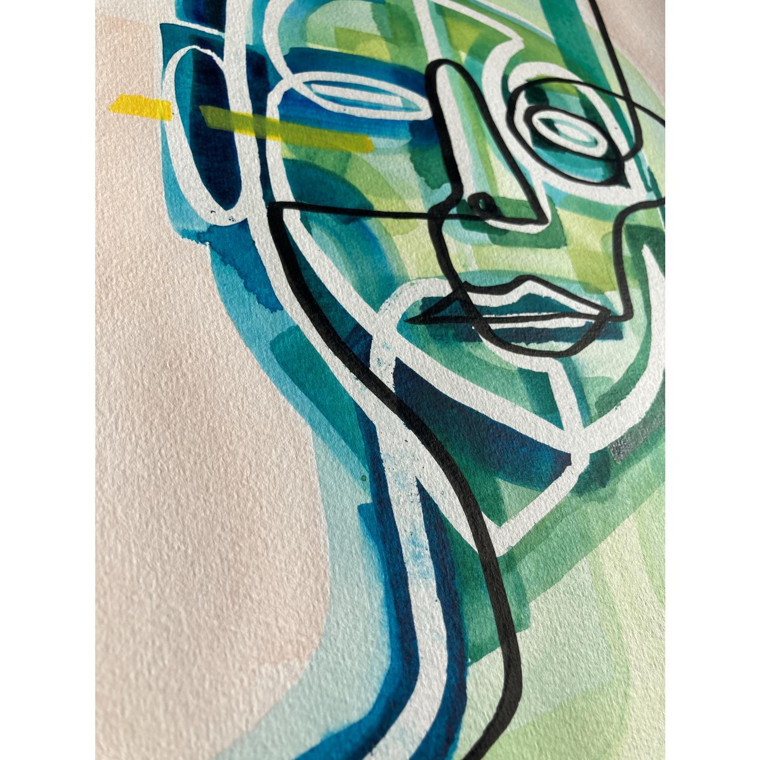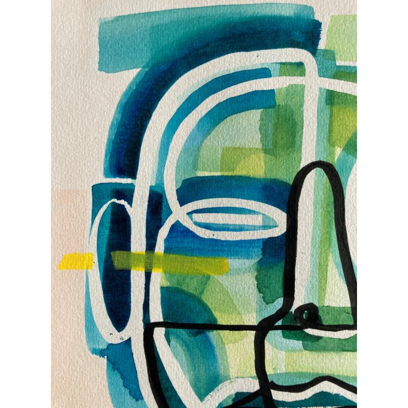 This unique and original work is done with watercolors, we can observe a portrait of someone looking straight ahead on a single white line, filled with numerous lines of green and blue tones and a continuous black line that moves from bottom to top marking certain deeper areas of the face.