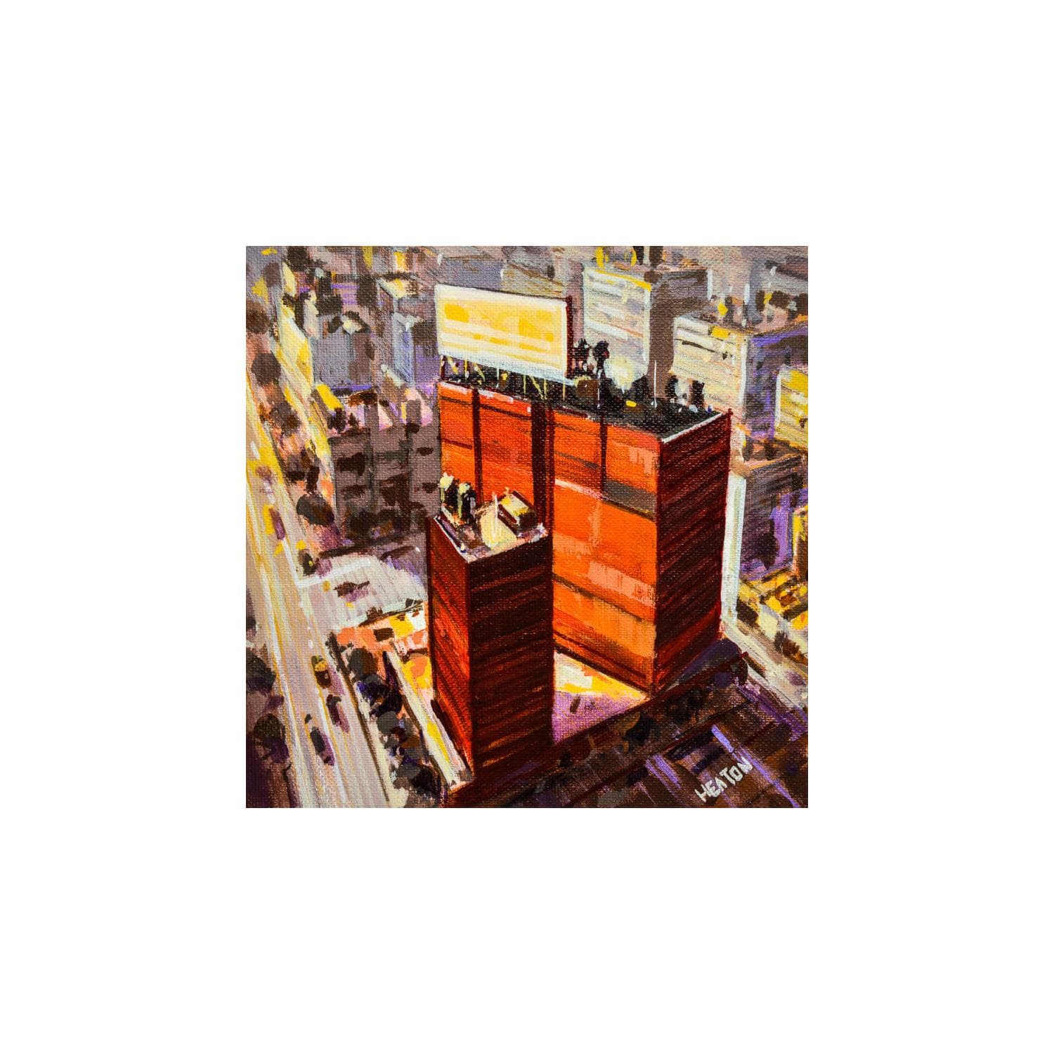 The contemporary artwork Two red buildings is a modern painting from the artist Rudyard Heaton. This is a contemporary painting, unique and originale, Urban style.