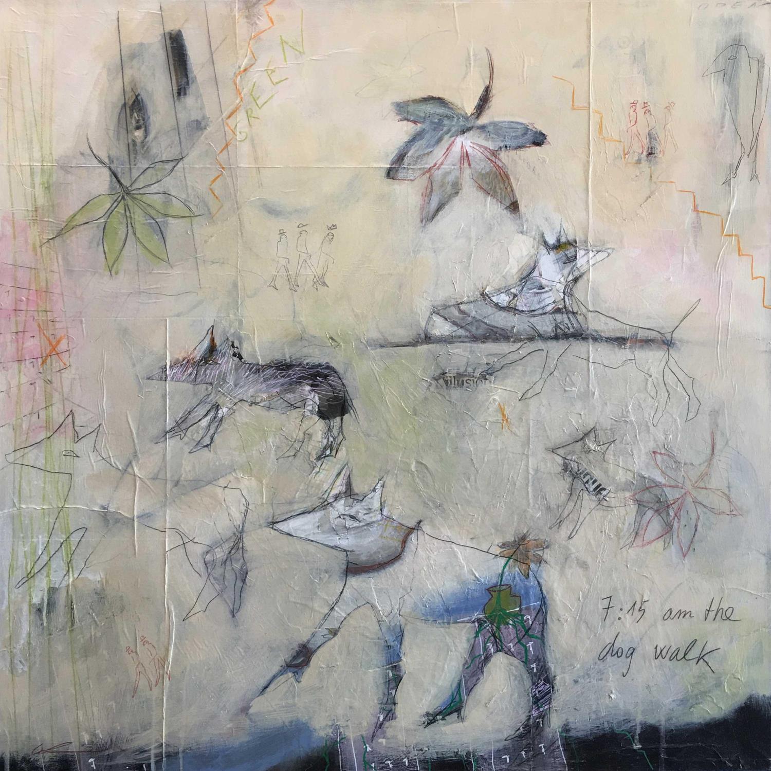 This unique and original contemporary artwork "7:15 AM the dog walk" on the subject of Animals has been created by the contemporary artist Colin Sylvie.