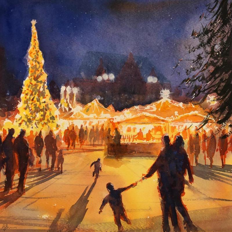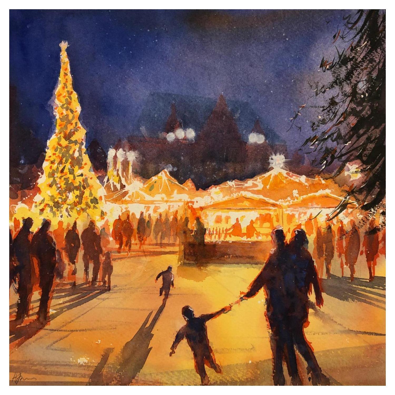 Pintura Weihnnachtsmarkt  por Jones Henry | Pintura Figurative Landscapes Urban Watercolor