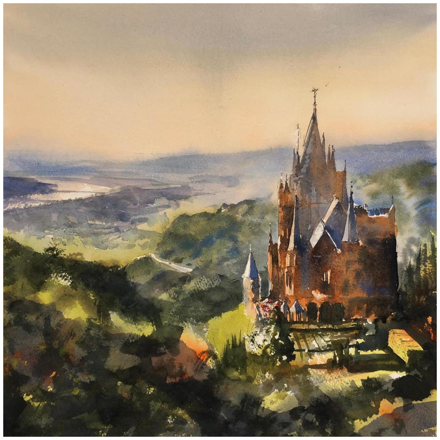 This unique and original contemporary artwork "Abend Schloss" on the subjects of Landscapes, Urban has been created by the contemporary artist Jones Henry.