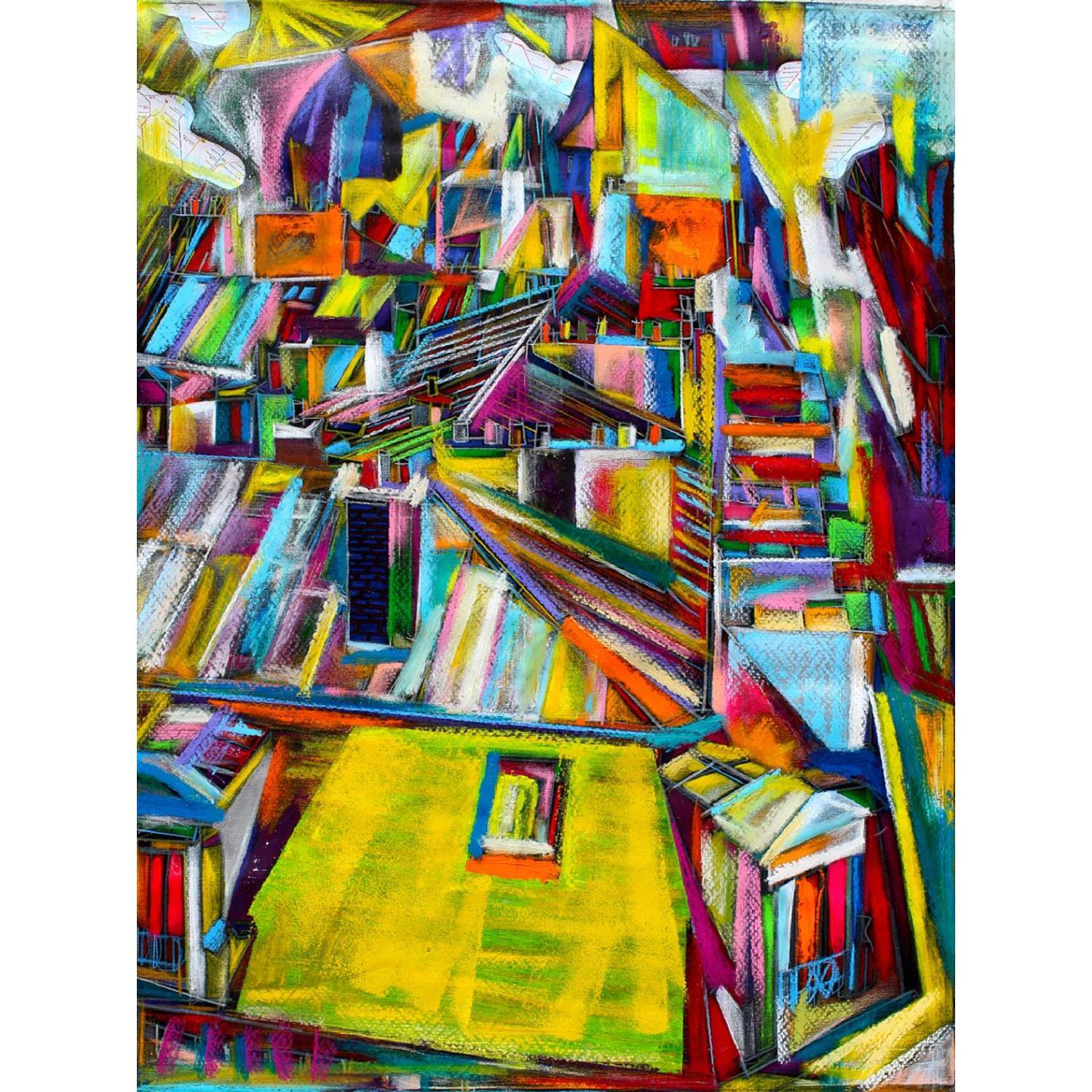This unique and original contemporary artwork "Une pluie de vacances" on the subject of Urban has been created by the contemporary artist Anicet Olivier.