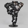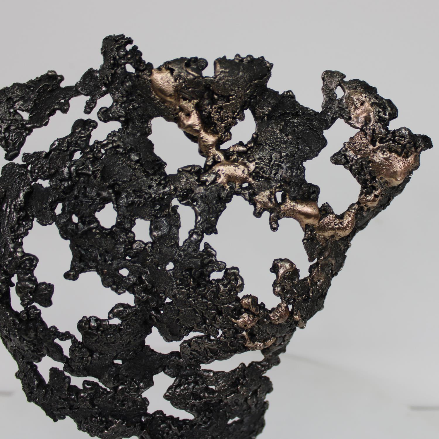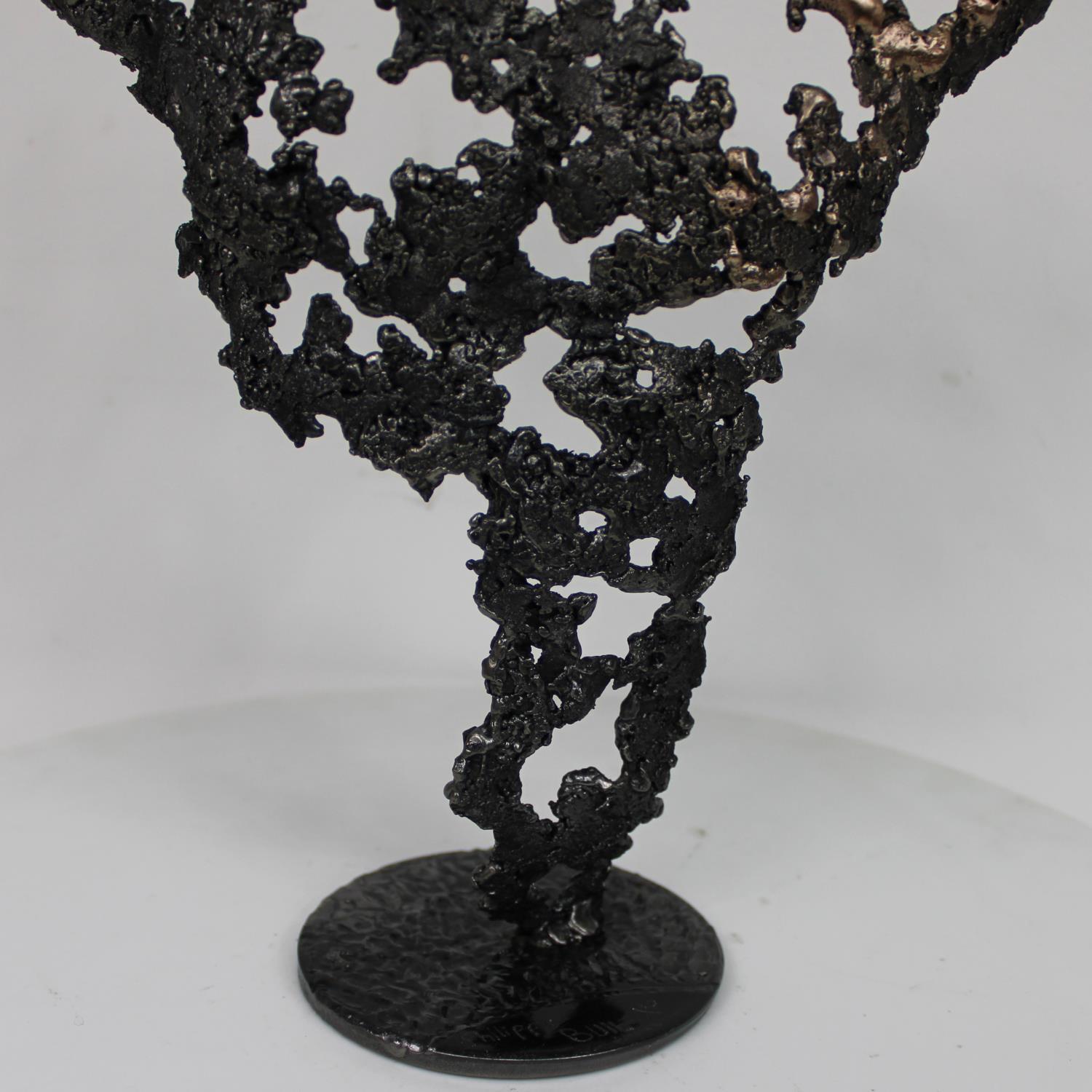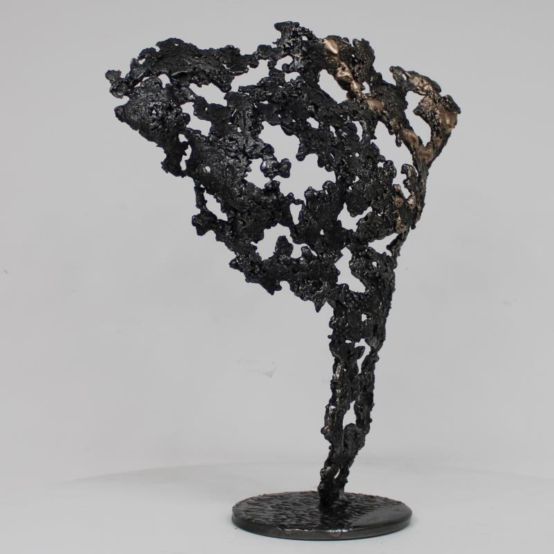 The sculpture represents a male body. It is made of lace metal: steel and bronze. The artist uses a metal dripping technique, obtaining this lace by drip-melting the metals.