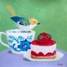 This unique and original contemporary artwork "Bird on a cup with strawberry cake" was created by contemporary artist Sally B.