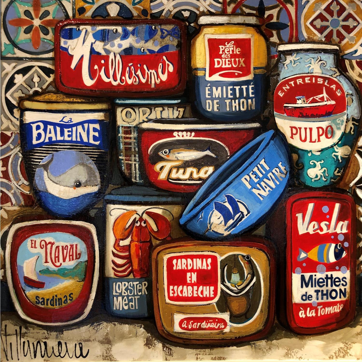 This unique and original contemporary artwork "Latas" on the subject of still-life has been created by the contemporary artist Villanueva Puigdelliura Natalia.