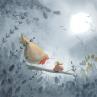 The artist imagined a poetic scene of a child and a robin under a full moon.