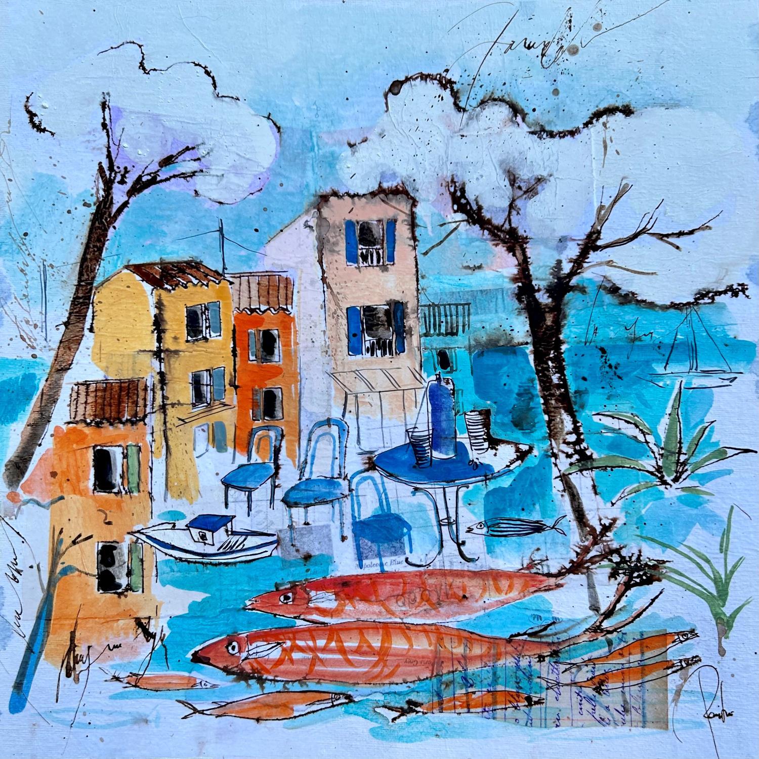This unique and original contemporary artwork "les sardines à la plage" on the subjects of Landscapes, Life style has been created by the contemporary artist Colombo Cécile.