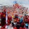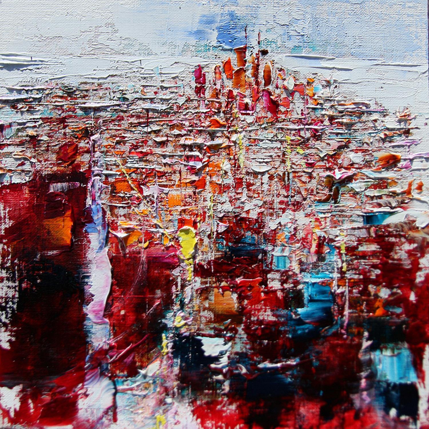 NYC" is a rather abstract depiction of the megalopolis. She chooses an overhanging viewpoint to build perspective through a succession of volumes of decreasing size, thus simulating gigantism. The motif is painted in oil and palette knife, playing on oppositions between warm (shades of red) and cool (shades of blue) colors. The painting's proportions give pride of place to the city, and the horizon is set very high to accentuate perspective and the vanishing point...