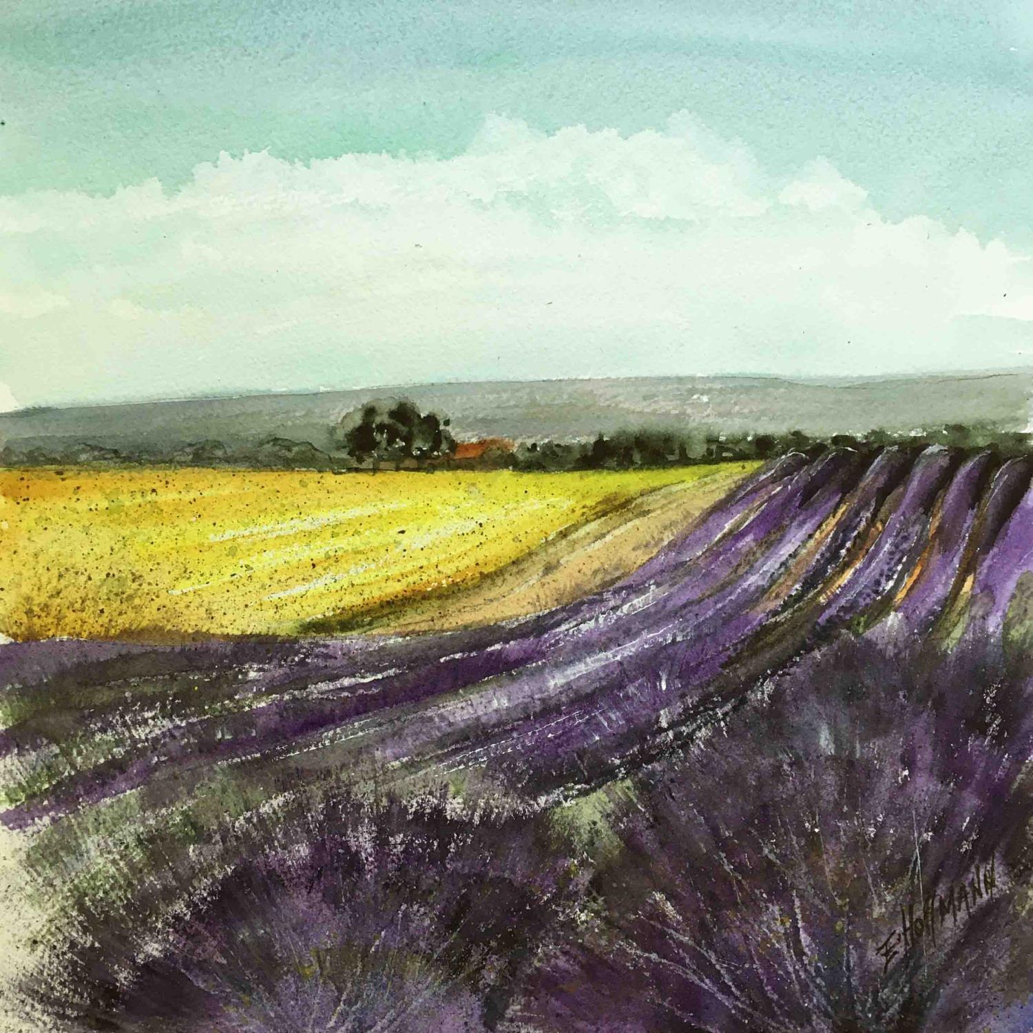 This unique and original contemporary artwork "Tournesols et lavandes" on the subject of Landscapes has been created by the contemporary artist Hoffmann Elisabeth.