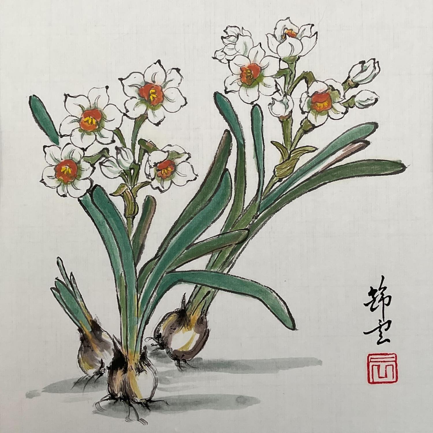 Pintura Narcisses blanches por Tayun | Pintura Figurative Nature Watercolor Ink