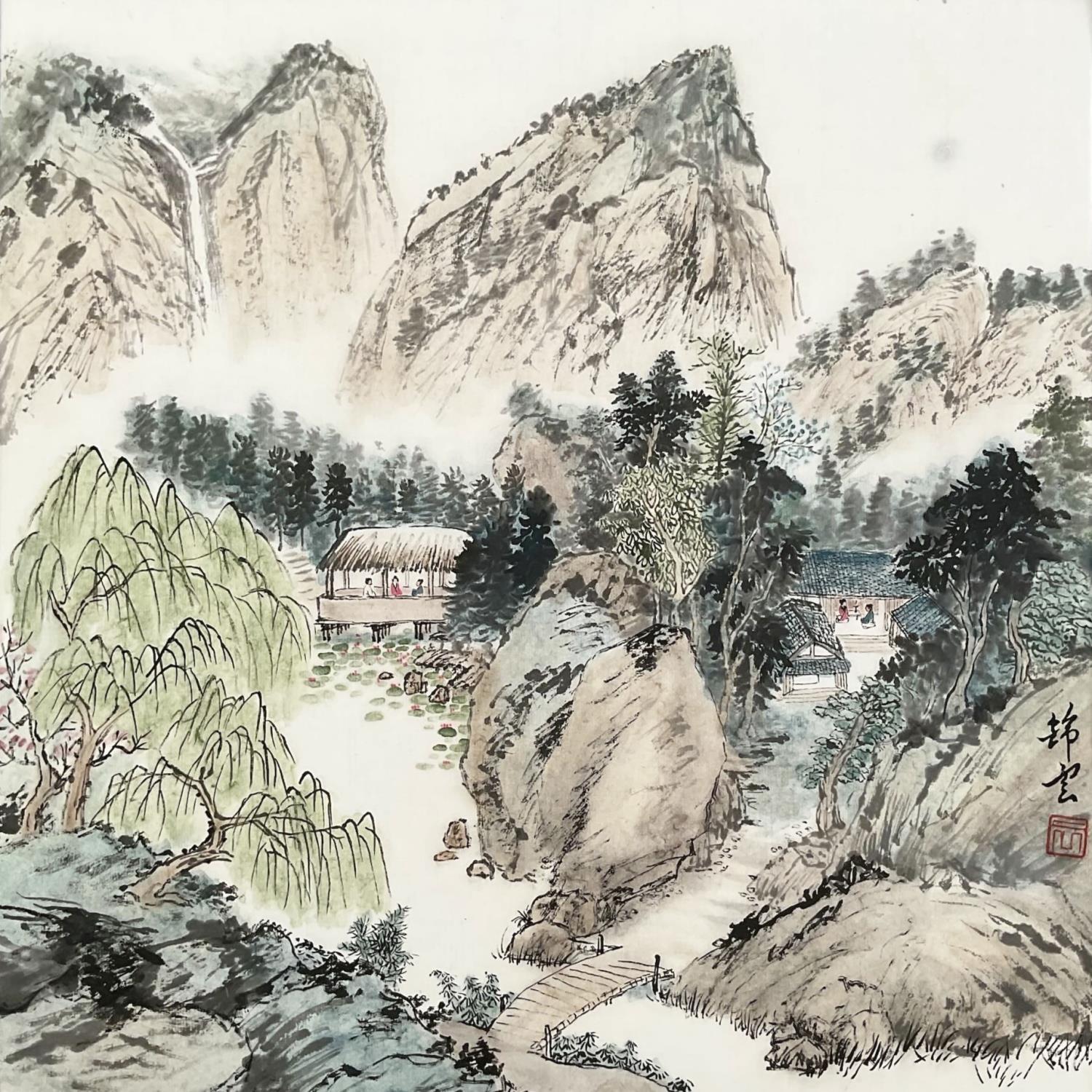 This unique and original contemporary artwork "Summer Landscape" was created by contemporary artist Tayun. The artist used various techniques to create this small-format figurative painting on paper.