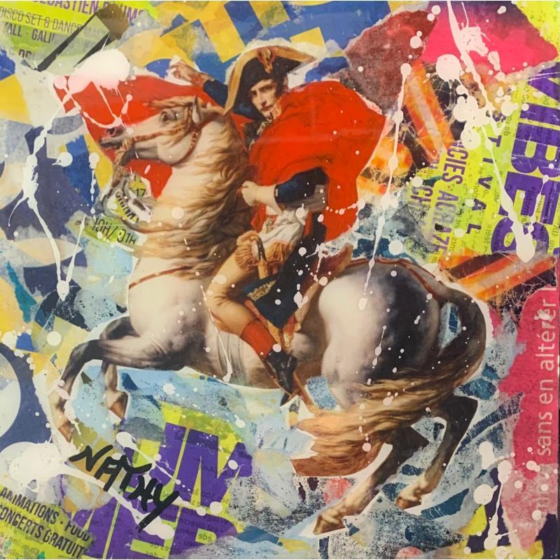 The artist used a mixed technique of collage, torn posters, acrylic paint and resin to create this small-format Pop-art painting on dibon on the theme of Pop Icons.