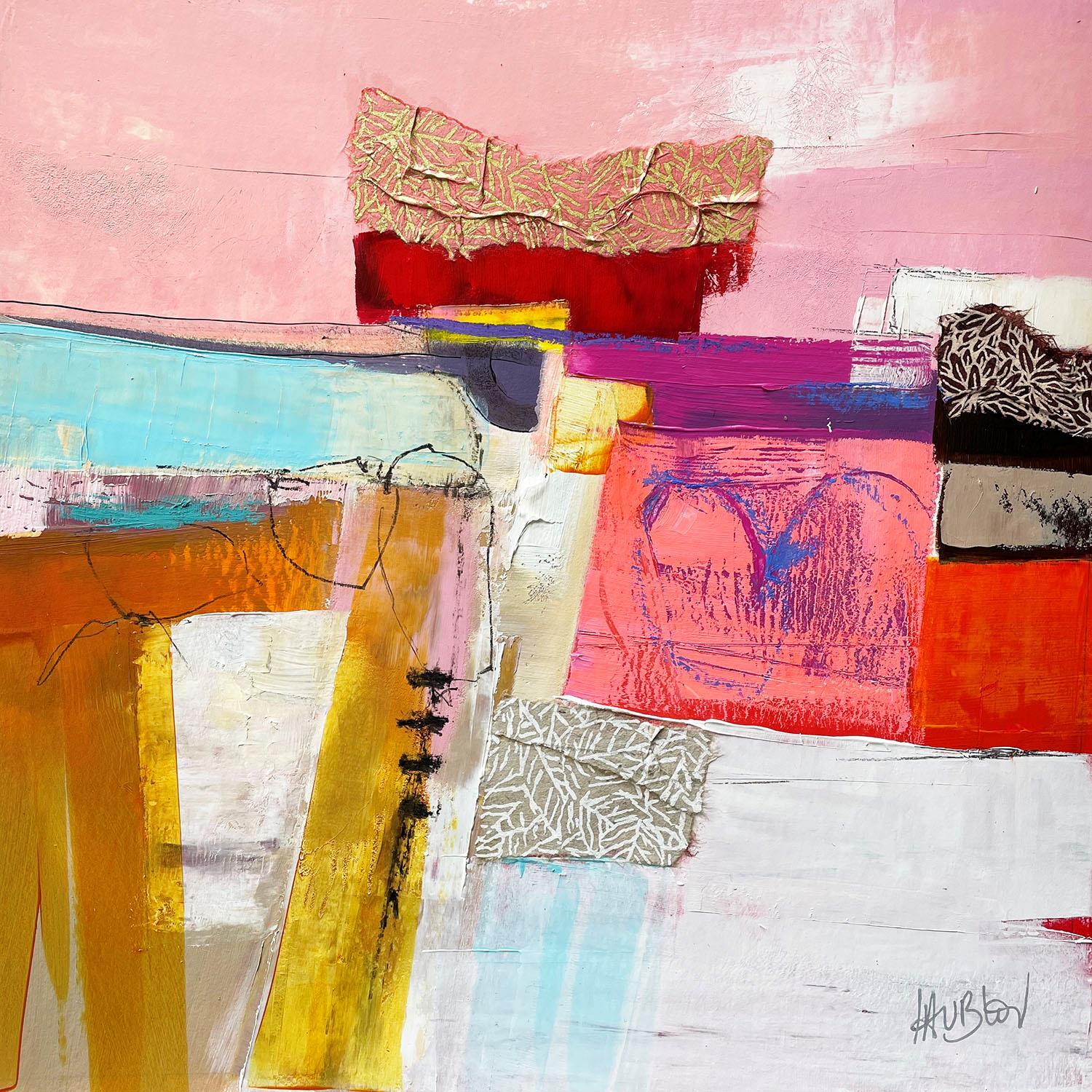 The artist used Cardboard, Acrylic, Gluing, Gold leaf, Paper media on Cardboard to create this Abstract, Small size painting.