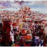 NYC" is a rather abstract depiction of the megalopolis. She chooses an overhanging viewpoint to build perspective through a succession of volumes of decreasing size, thus simulating gigantism. The motif is painted in oil and palette knife, playing on oppositions between warm (shades of red) and cool (shades of blue) colors. The painting's proportions give pride of place to the city, and the horizon is set very high to accentuate perspective and the vanishing point...