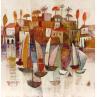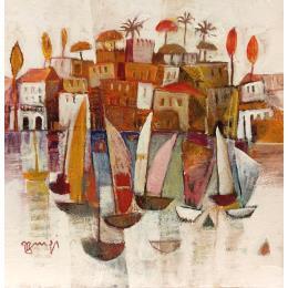 This unique and original contemporary artwork "Village or et bateaux AM27" on the subject of Marine has been created by the contemporary artist Burgi Roger.