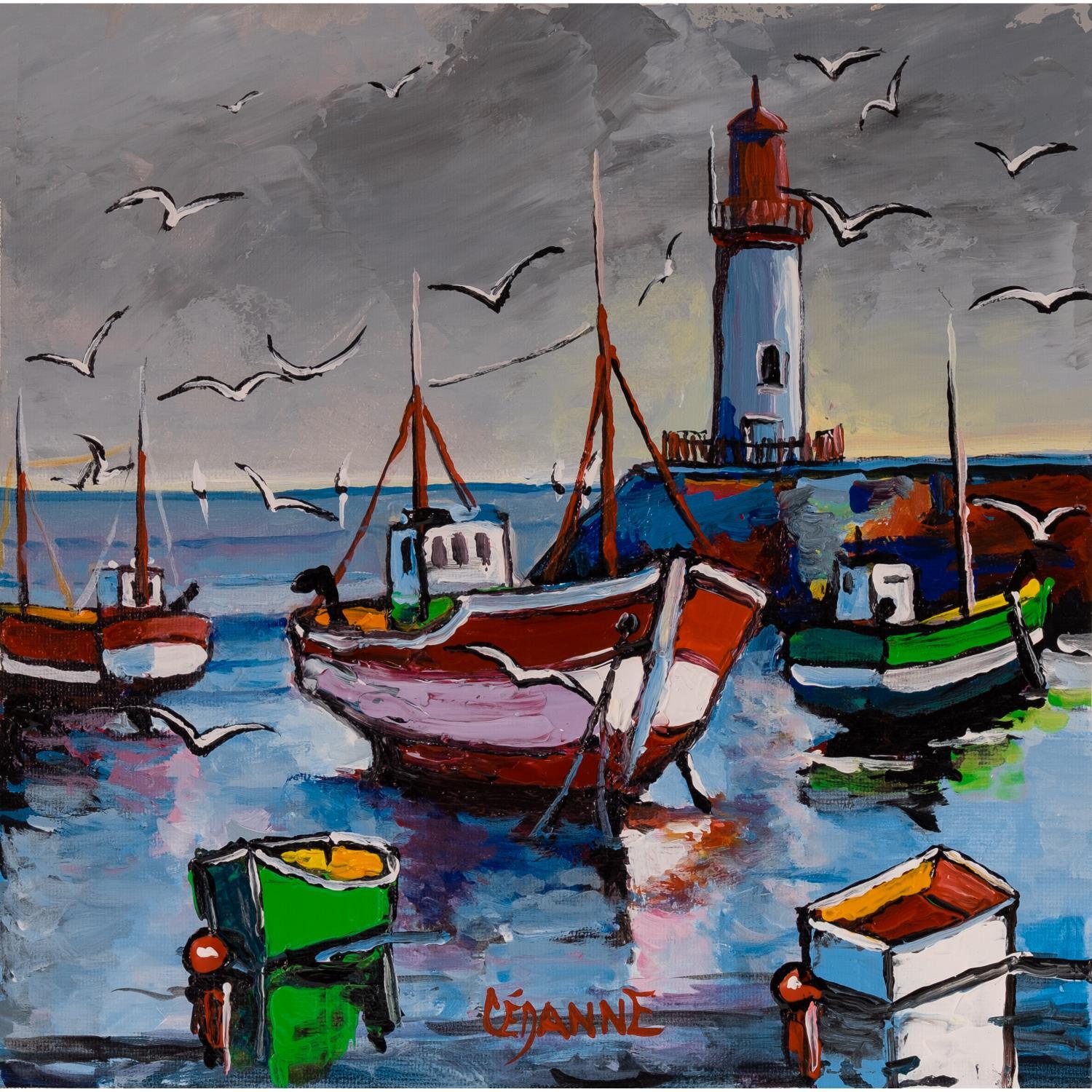 This unique and original contemporary figurative work of art was created by the painter Cèdanne. The artist used a variety of techniques to create this small-format painting on canvas, in his distinctive style, of a Breton landscape of boats in port at low tide, under a flock of seagulls.