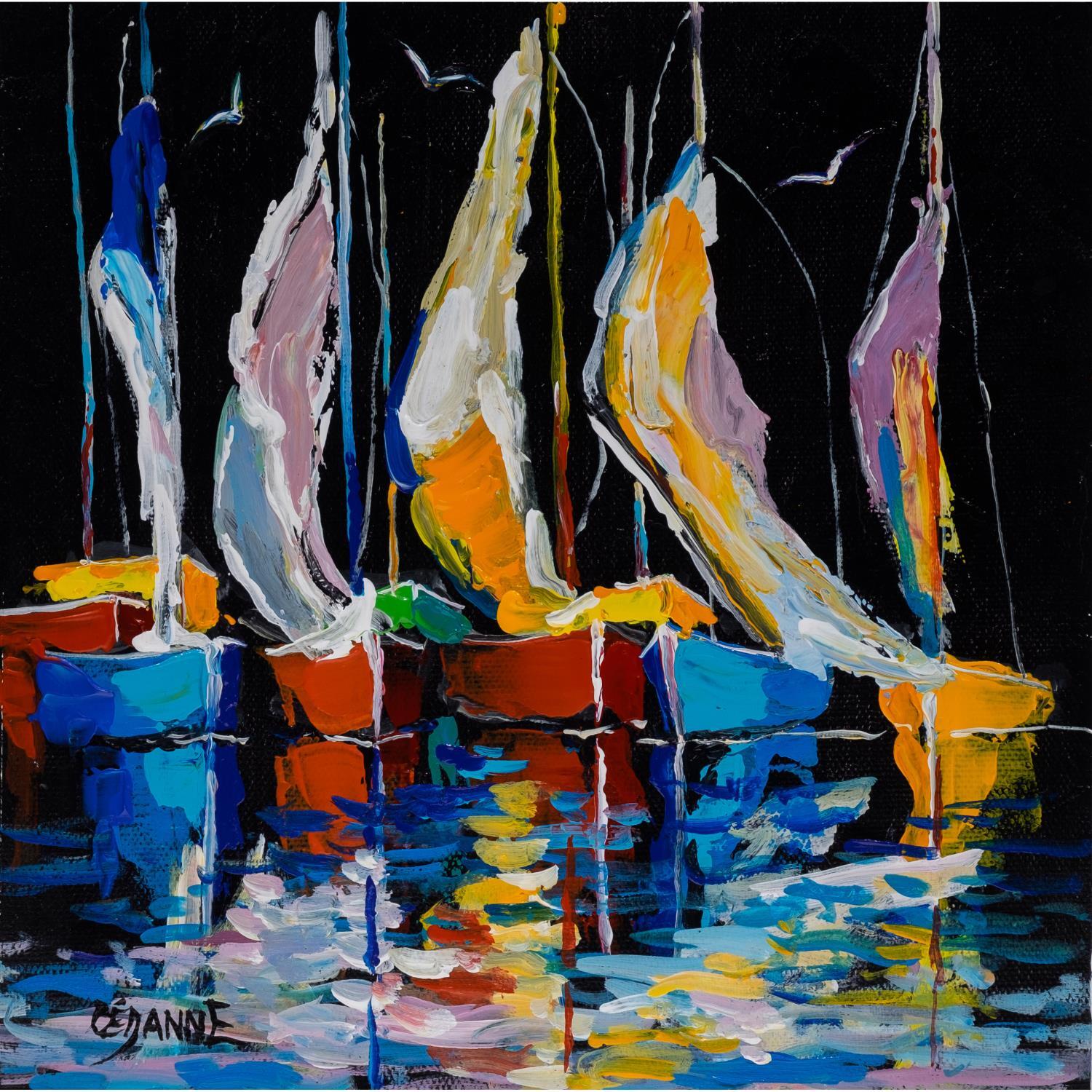 This unique and original contemporary figurative work of art was created by the painter Cèdanne. The artist used a variety of techniques to create this painting on canvas, treating this scene of sailboats in port with his distinctive style.