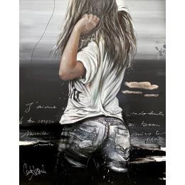 After pursuing a double education devoted to the Fine Arts and to Visual Arts, Cécile began her career as a teacher. As she spent her time imparting her techniques and cultural knowledge to students, the artist from Avignon also began to make her own art on the side. Cécile is deeply attached to the notion of gestures in her artistic practice and quickly turned her attention to works of Action Painting, and especially to artistic creations by the French artists Ernest Pignon-Ernest (born in 1942) and Jacques Villéglé (born in 1926). The artist then began writing her own artistic language, lending special attention to typographic characters in the composition of her works, combined with the predominance given to gestures in her pieces. Her efforts to capture movement on her canvas, to "capture forever that which is fleeting, and all that is furtive", is a quest that has always been a motor for the artist, who has never stopped proving herself over the years.