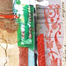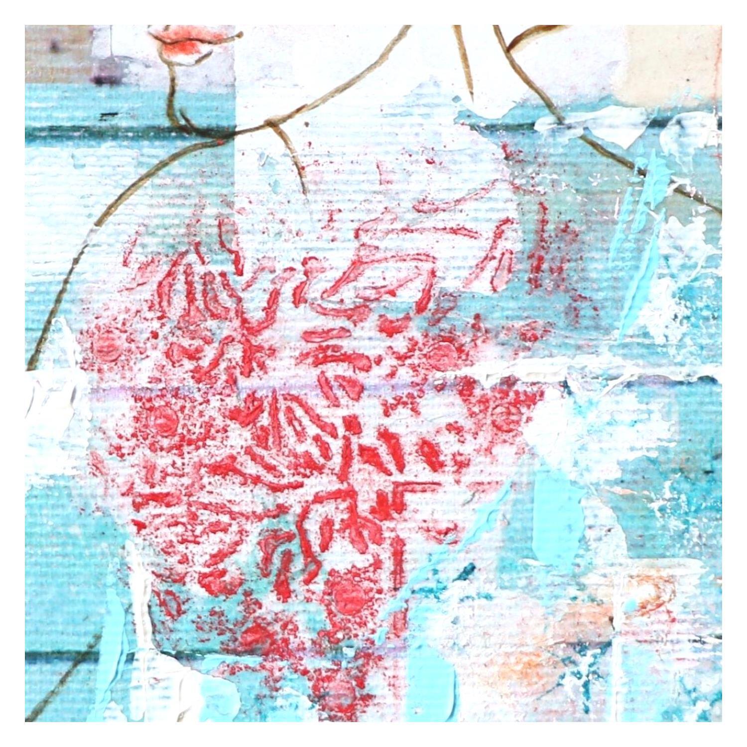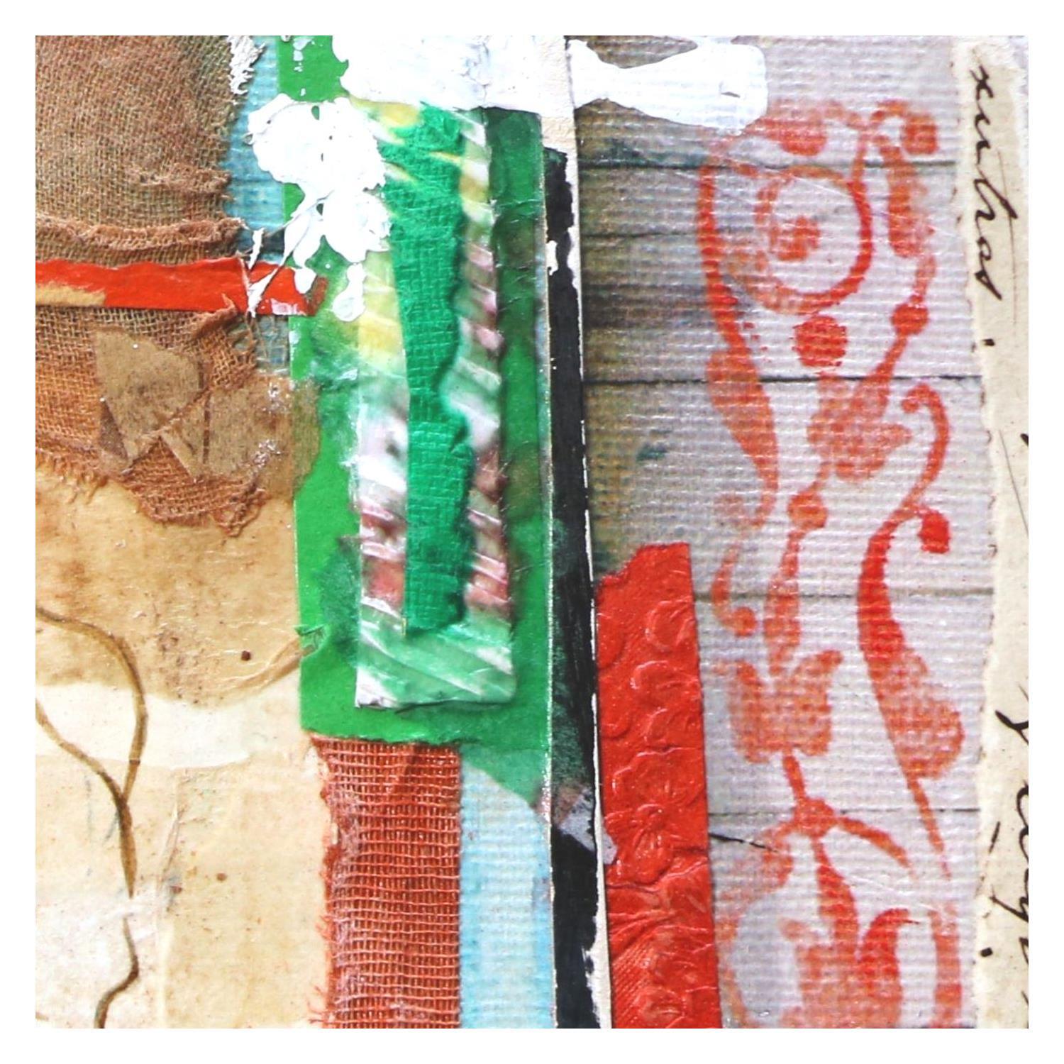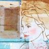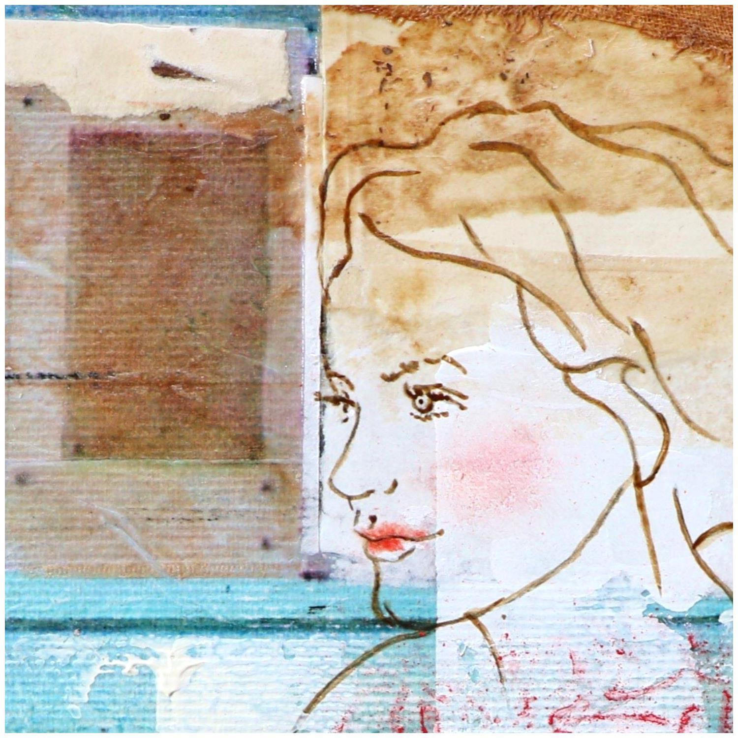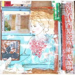 The artist used Acrylic, Wood, Cardboard, Gluing, Ink, Gold leaf, Paper, Pastel, Pigments, Textile, Upcycling media on Canvas to create this Figurative, Small size painting.