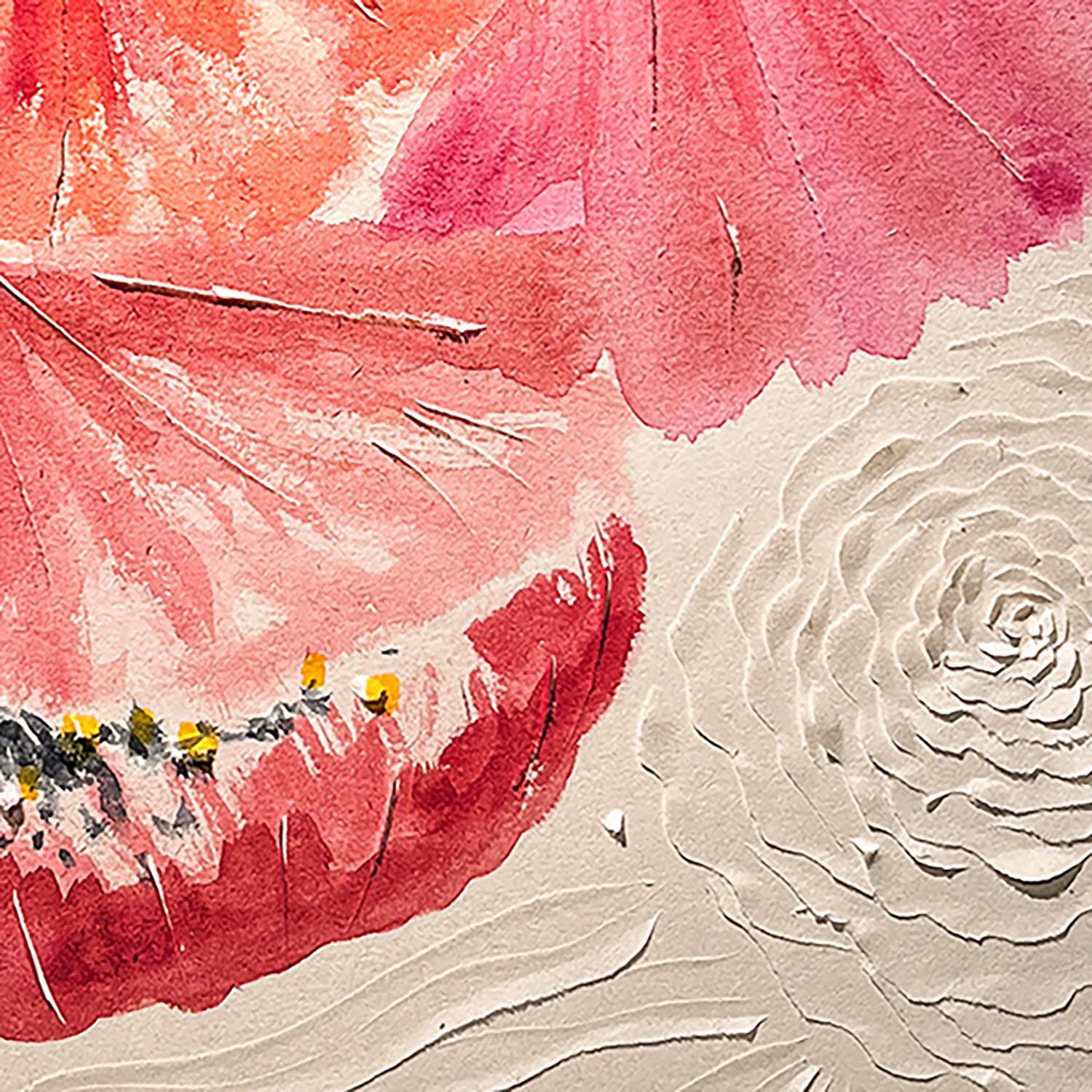 The artist used watercolor techniques on carved wood cardboard to create this small-format painting on cardboard in the Matiérisme Figuratif style on a minimalist floral theme.