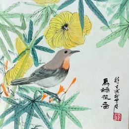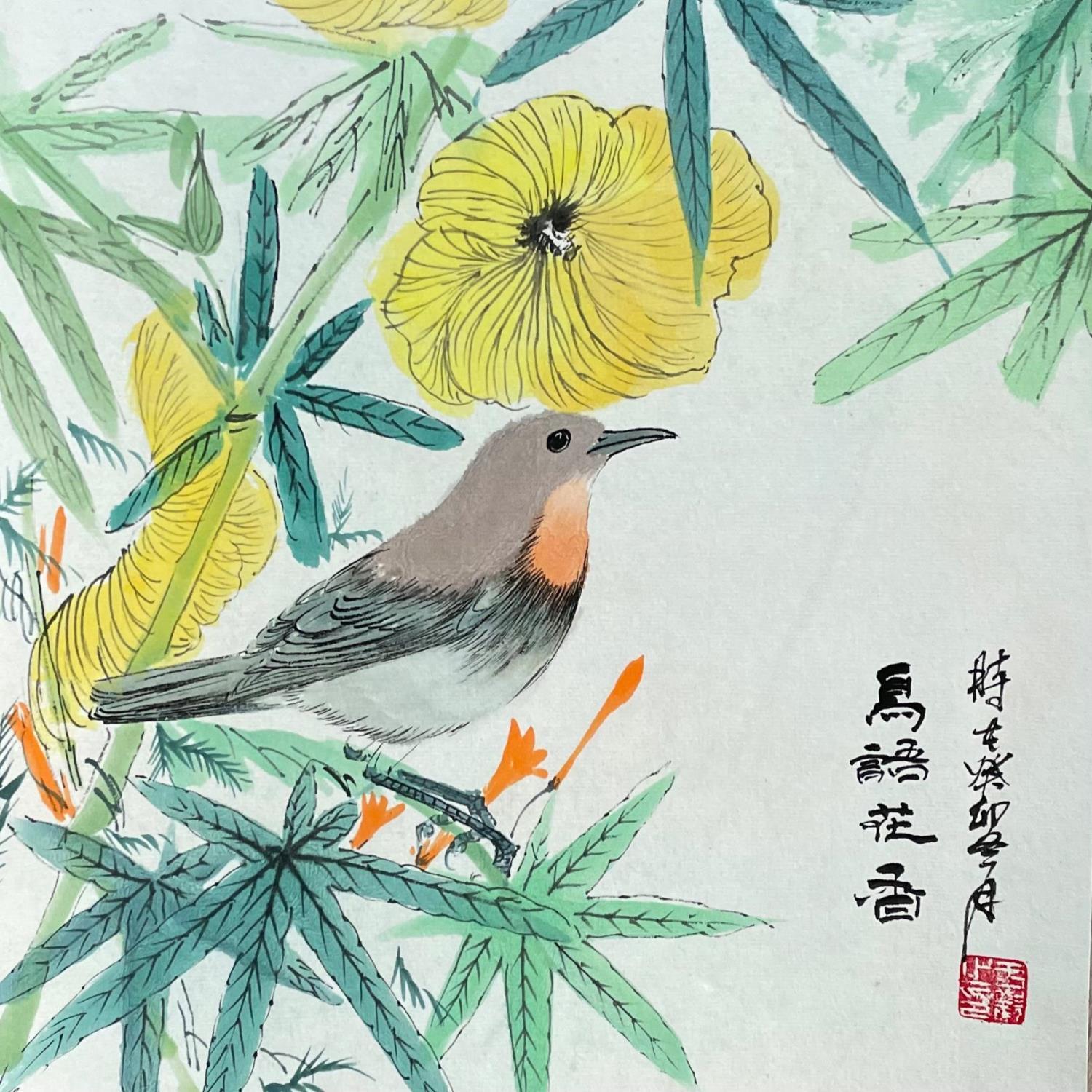 This unique and original contemporary artwork "Singing bird and blooming flowers" has been created by the contemporary artist Yu Huan Huan.