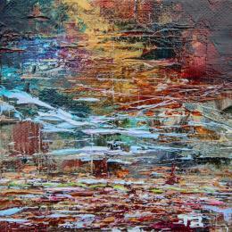 Paris" represents the city in a metaphorical, non-figurative way. She chooses an overhanging vantage point to highlight the capital's rooftops, whose reliefs and ridges create an undulating, almost maritime movement, accentuated by the liquidity of the paint. The motif is painted in oil and palette knife, playing on oppositions between warm (shades of red) and cool (shades of blue and green) colors. The proportions of the painting, two-thirds of which is dominated by the sky, are designed to accentuate the perspective and majesty of the motif. The sky, moreover, echoes the opposition between cold (left) and warm (right) hues, the two masses being linked by the stringy, torn clouds that give depth to the space.