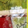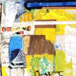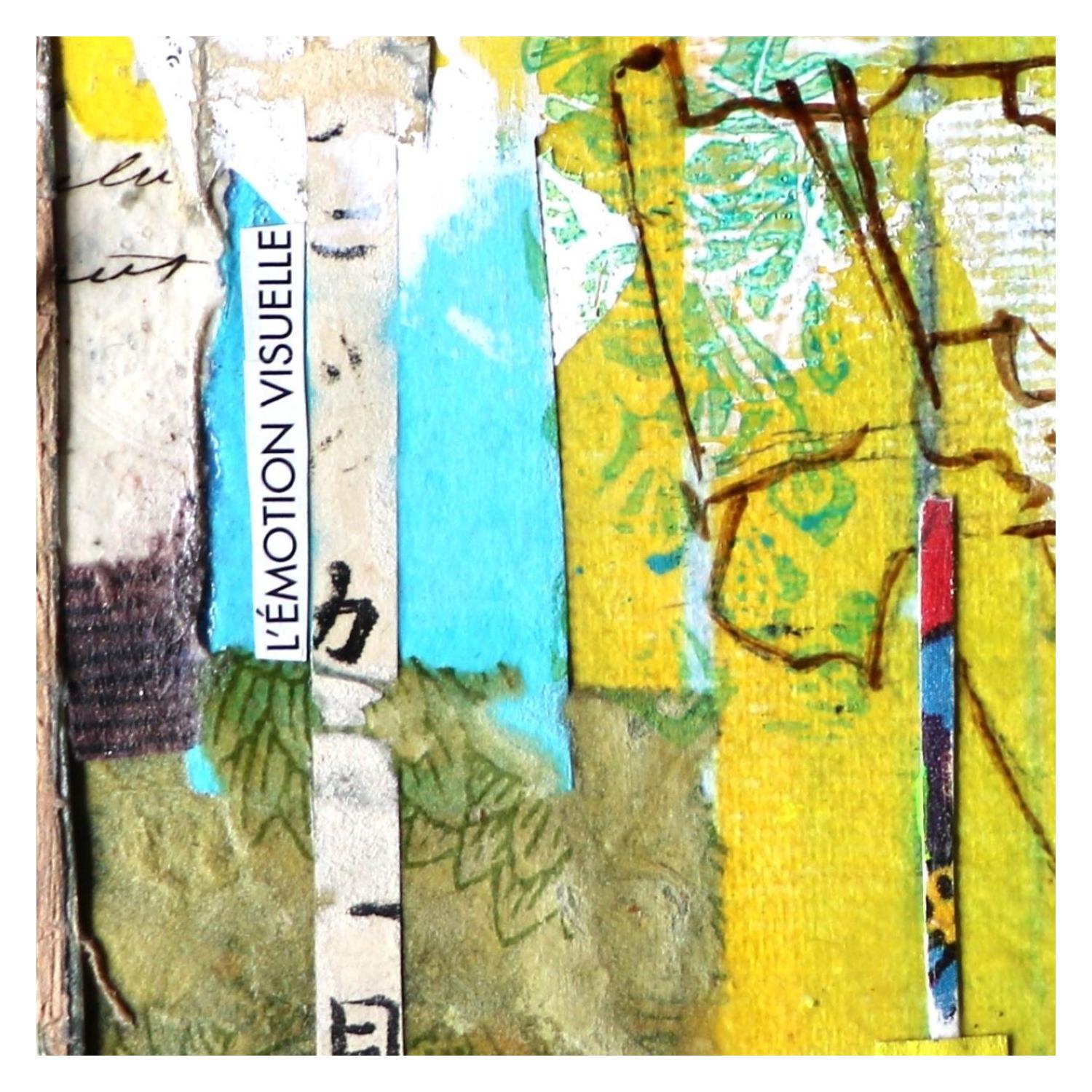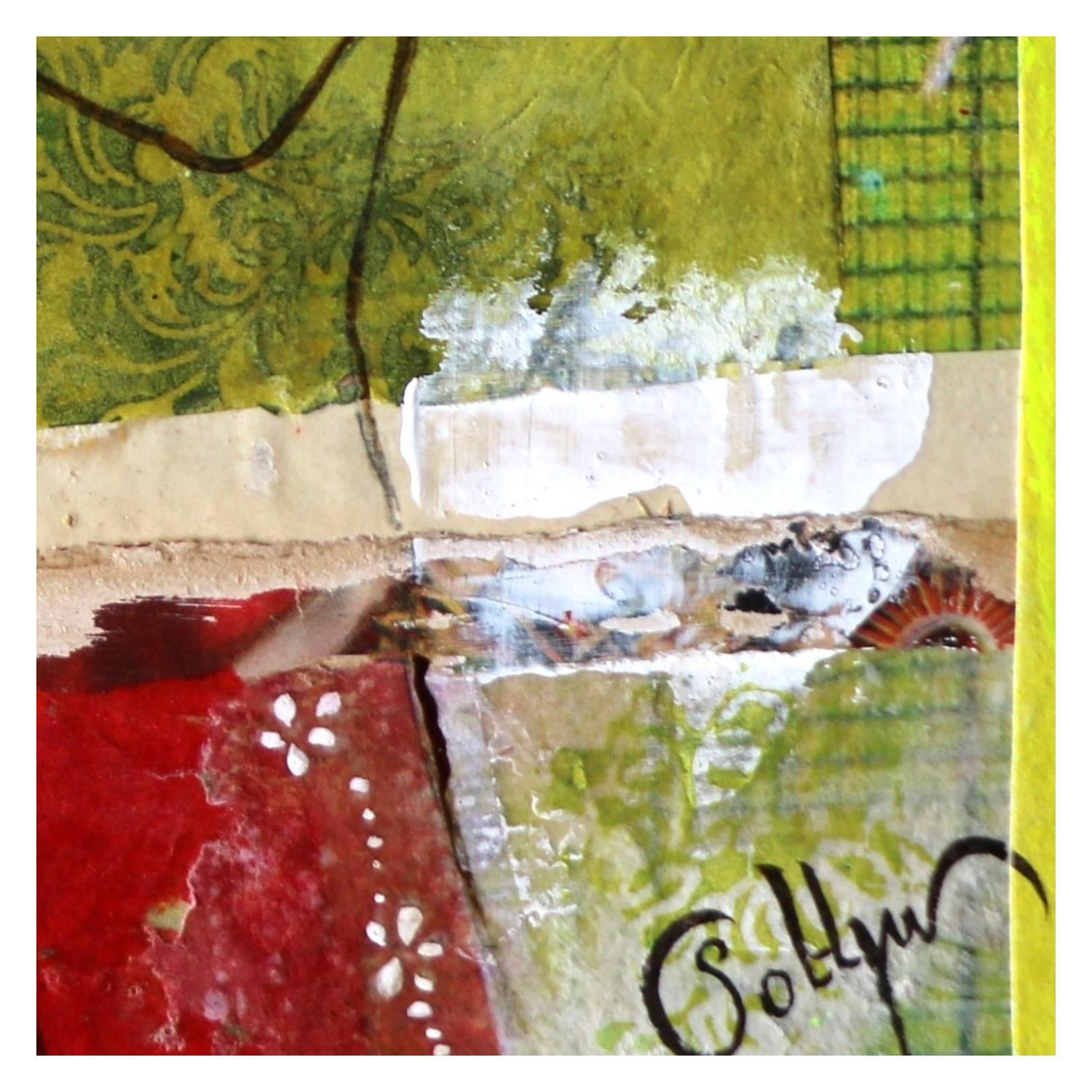The artist used mixed media, upcycling, dry pastels, ink, acrylics, stamping and recycled materials to create this small-format painting on canvas on wood in the figurative art style.