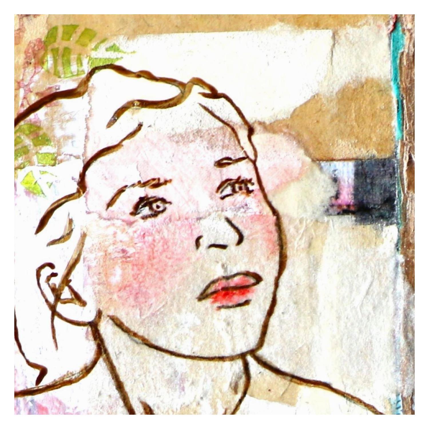 The artist used mixed media, upcycling, dry pastels, ink, acrylics, stamping and recycled materials to create this small-format painting on canvas on wood in the figurative art style.