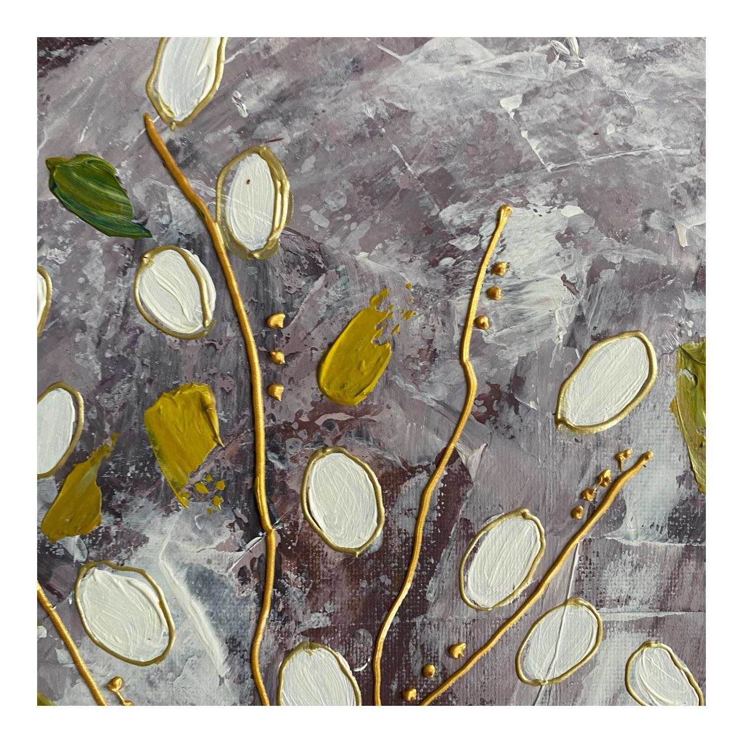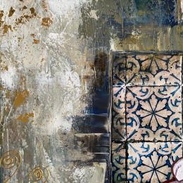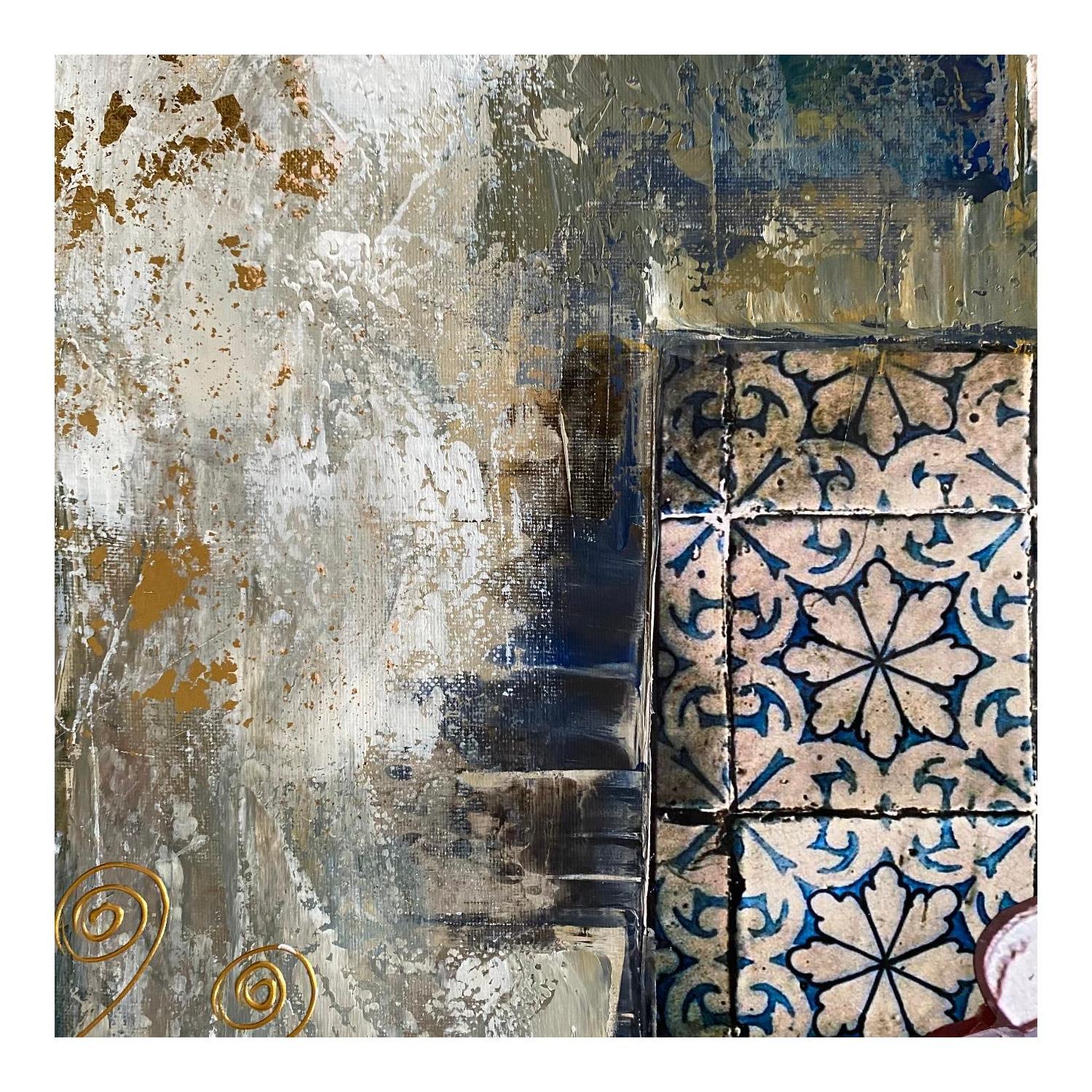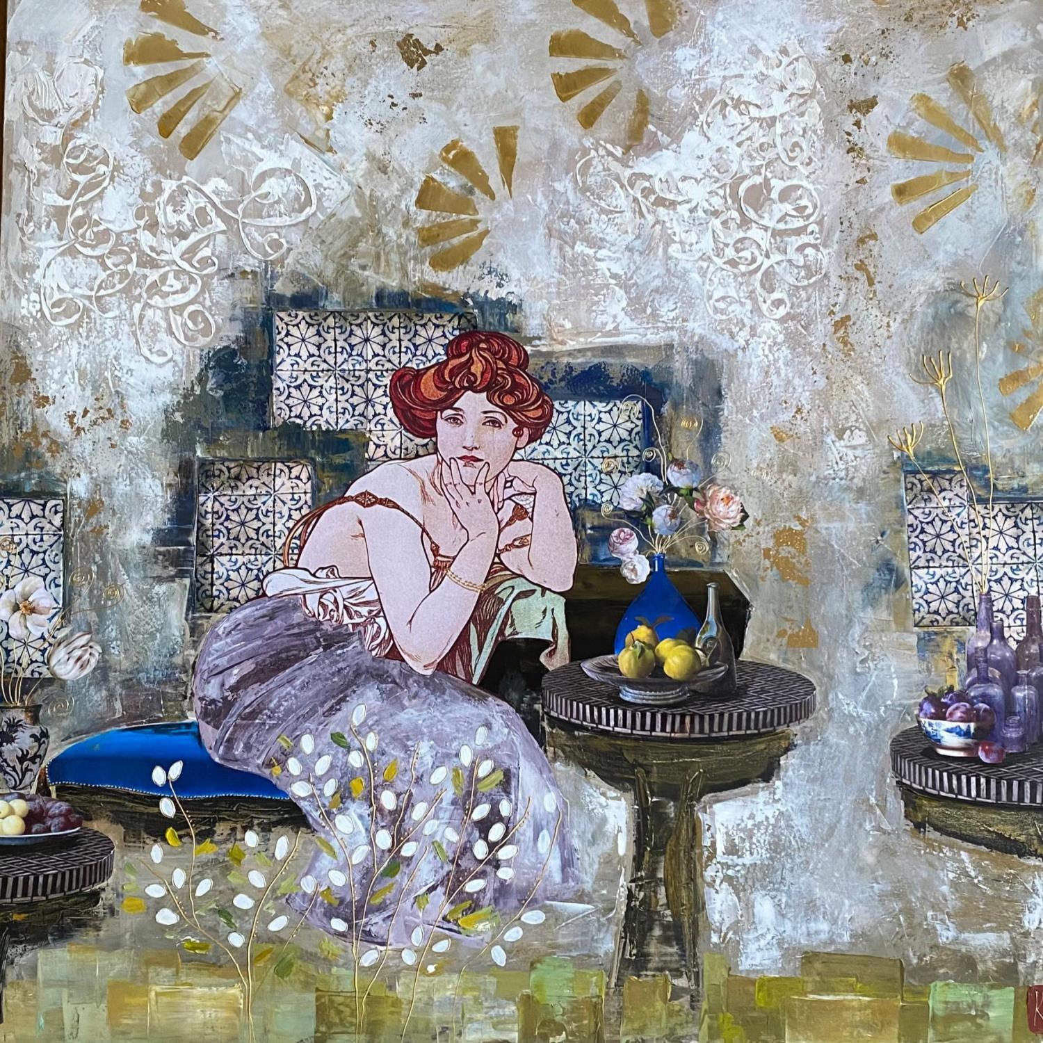 The artist used Acrylic, Gluing, Gold leaf, Paper, Pastel, Posca media on Canvas to create this Figurative, Large size painting.