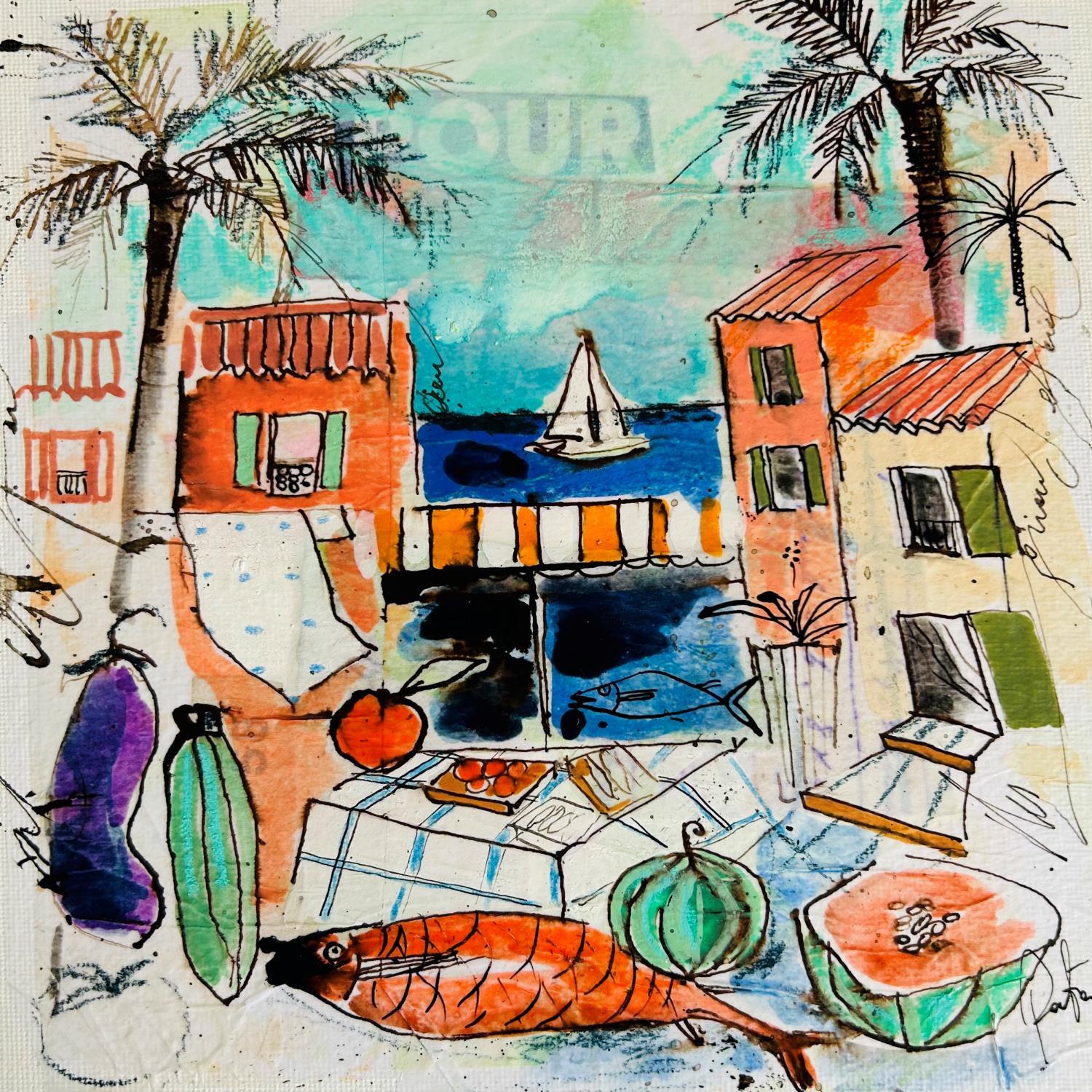 This unique and original contemporary artwork "L' heure du marché" on the subjects of Landscapes, Life style has been created by the contemporary artist Colombo Cécile.