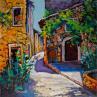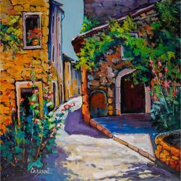 This unique and original contemporary artwork "Vieilles pierres et roses trémières" on the subjects of Landscapes, Life style, Urban has been created by the contemporary artist Cédanne.