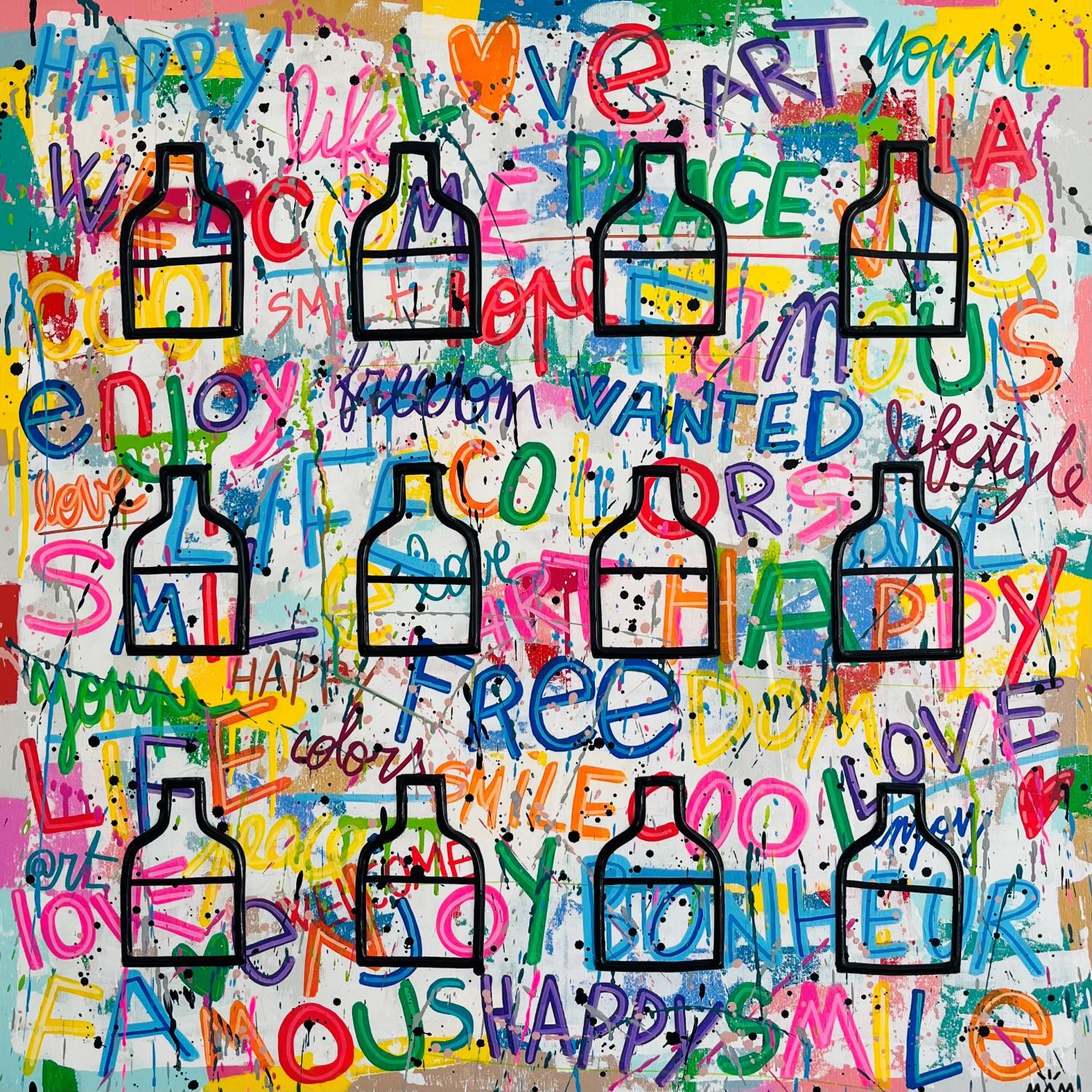 This unique and original contemporary artwork "L'ABUS DE COULEURS EST BON POUR LA SANTE" on the subjects of Pop icons, Still-life, Society has been created by the contemporary artist Mam.