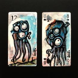 The Breton Loic Tarin, aka Doudoudidon, passed the baccalaureate, then a degree in advertising graphic design. He started off creating images and illustrations, and more recently it clicked into place for him that he should start an artistic life. Influenced by his often technical and scientific readings and listening, he has long wondered about the layout of the universe, Darwinian theories, human sciences… Considering that "he knows nothing", he creates poetic, expressive and intuitive "paintings" (for him painting his first and foremost silent poetry). The idea of distortion of media is the basis of his artistic practice. He likes to use what is initially recyclable waste. He also likes to distort objects like playing cards with themes inspired by the Middle Ages.