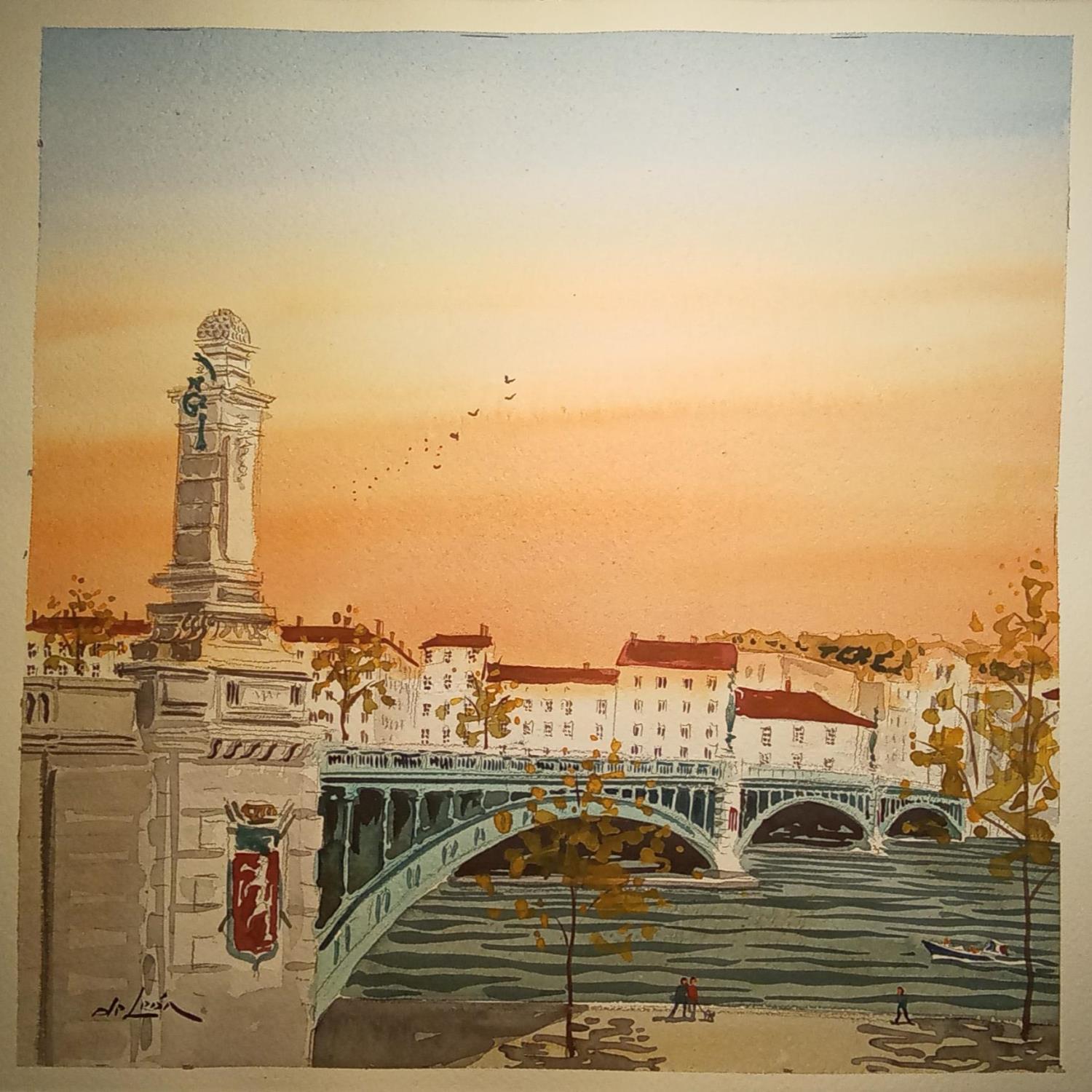 Pintura Tranquillité sur le quai  por De León Lévi Marcelo | Pintura Figurative Urban Watercolor