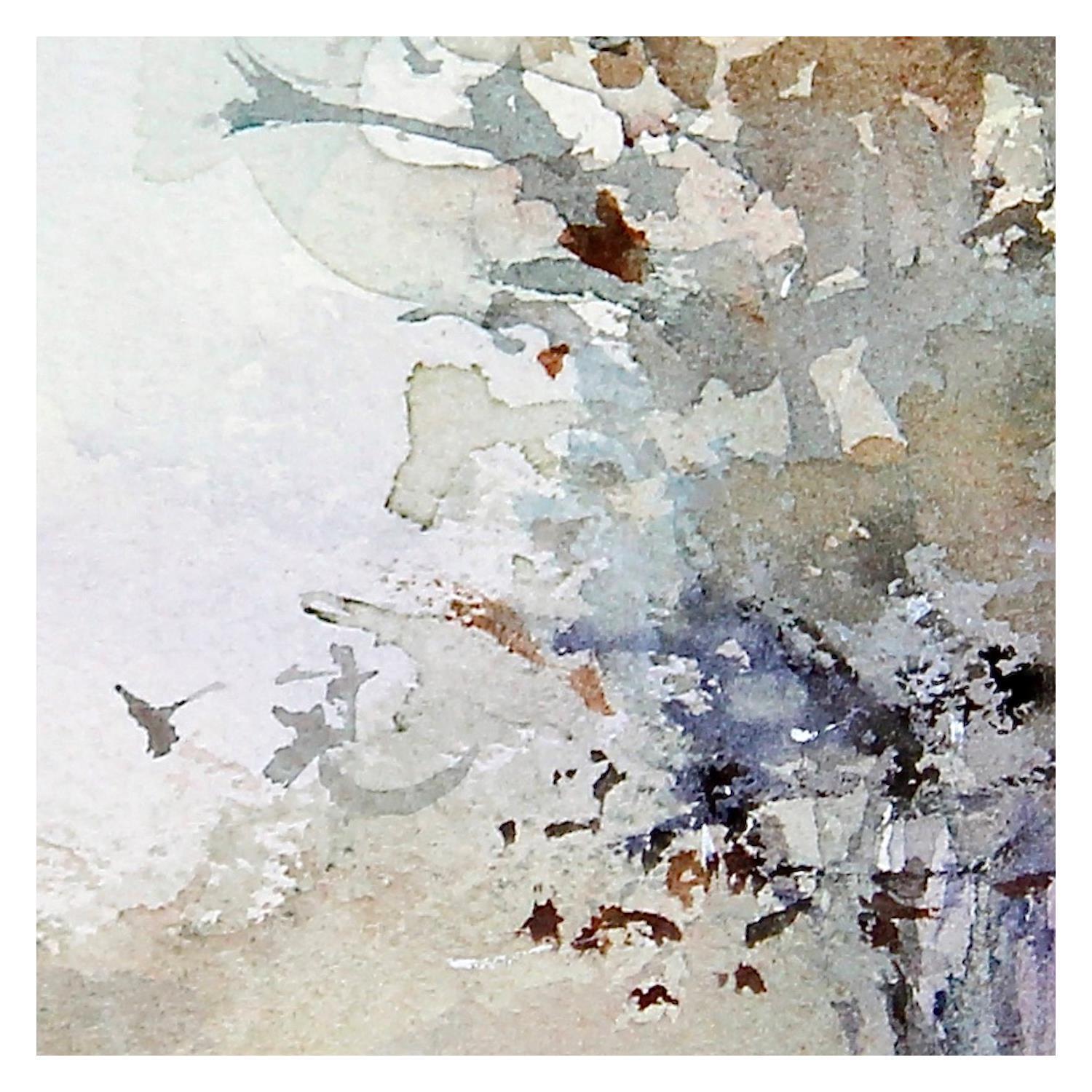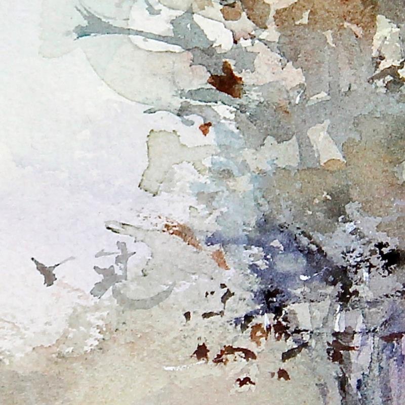 The artist used a watercolor technique to create this small-format figurative painting on an urban theme.