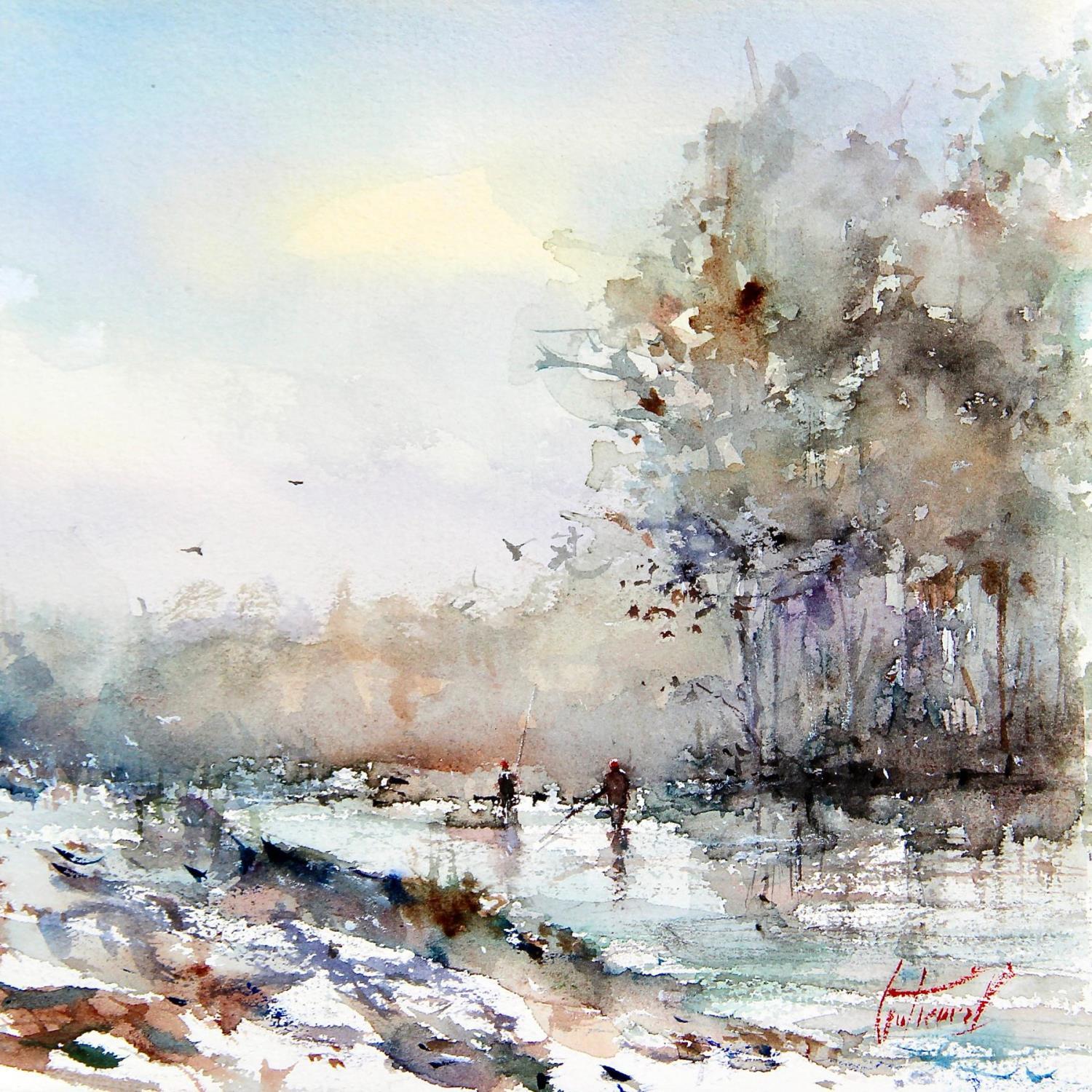 Pêche à la mouche en TourainePintura Pêche à la mouche en Touraine por Gutierrez | Pintura Impressionism Landscapes Watercolor