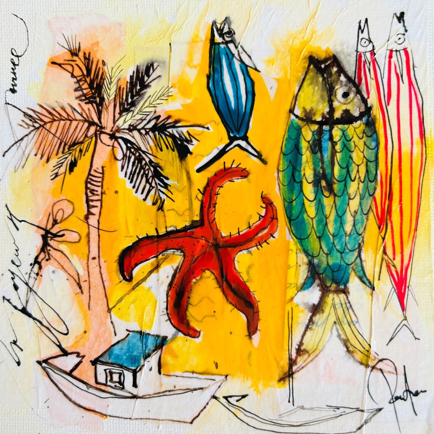 The artist used Acrylic, Gluing, Ink, Pastel media on Canvas board to create this Figurative, Small size painting.