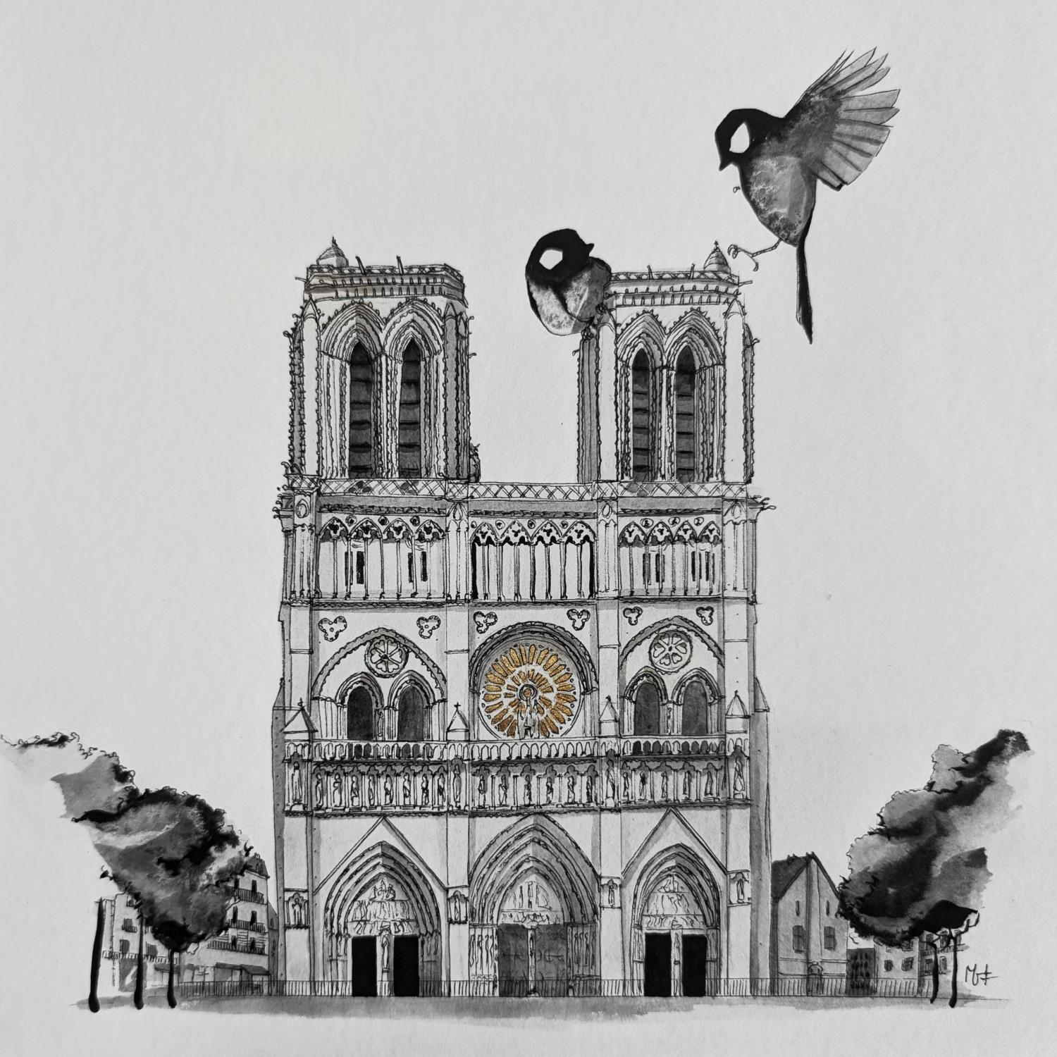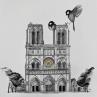 This unique and original contemporary artwork "Notre dame" on the subjects of Black & White, Animals, Architecture has been created by the contemporary artist Mü.
