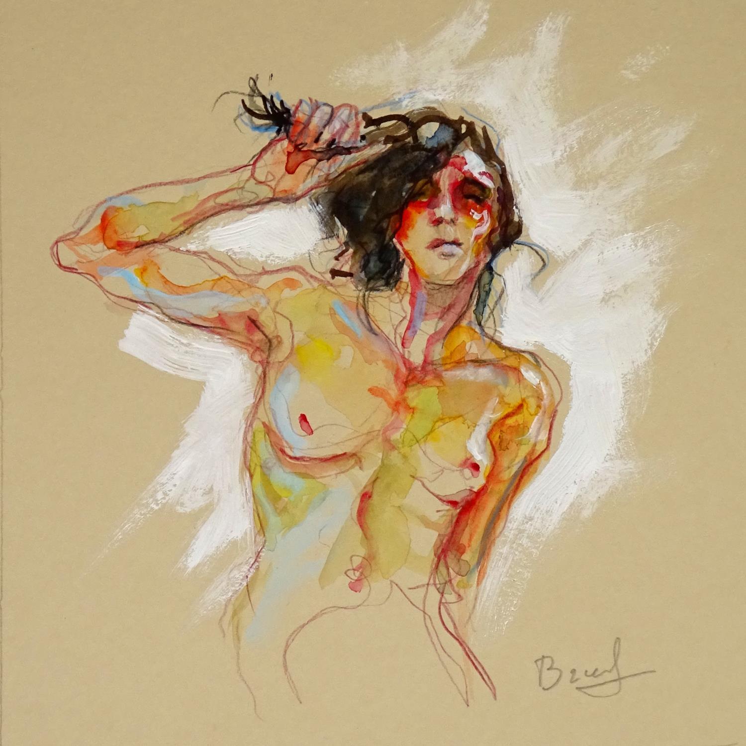 Pintura Aurora mains dans les cheveux por Brunel Sébastien | Pintura Figurative Nude Watercolor Gouache