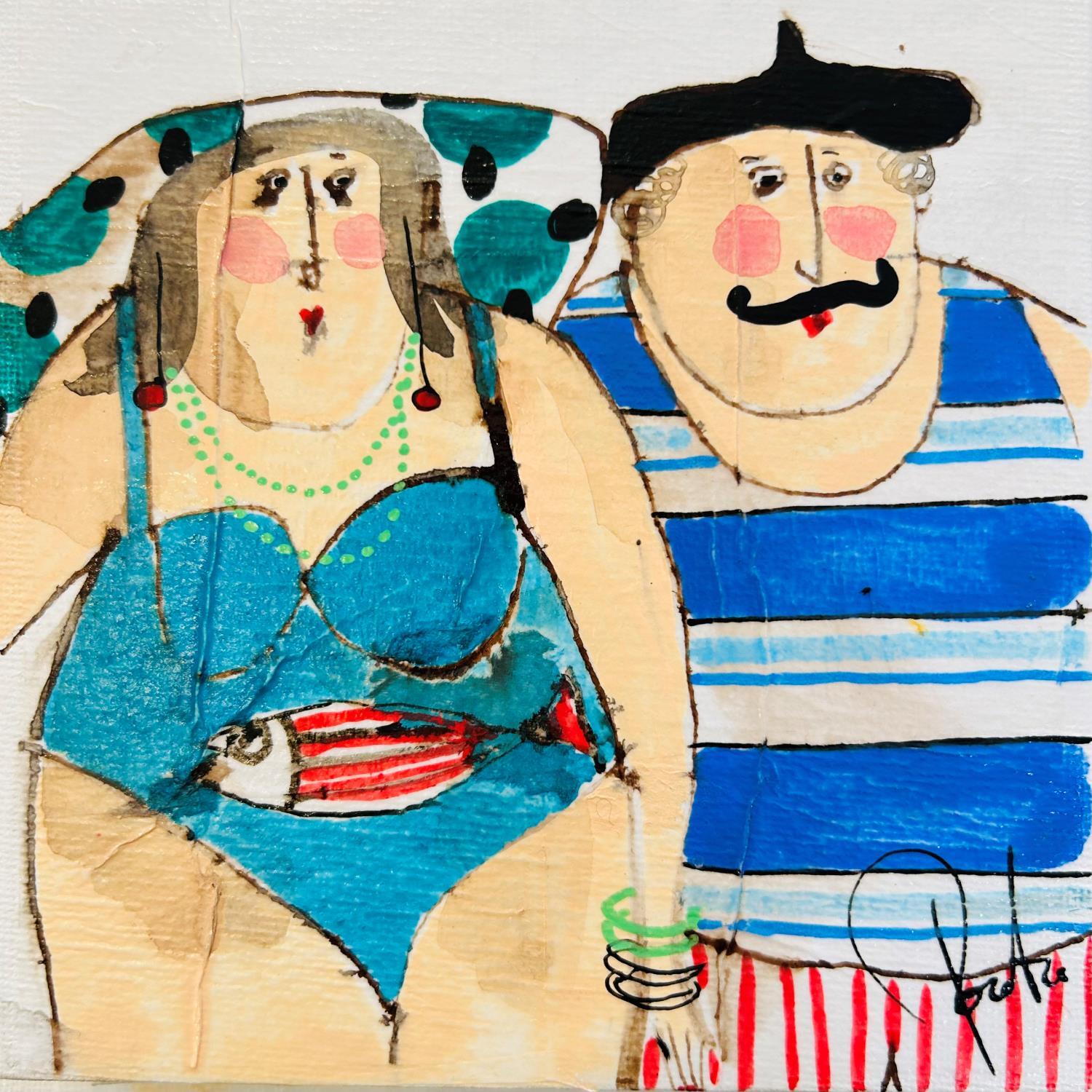 The artist used Acrylic, Watercolor, Gluing, Ink, Pastel media on Canvas to create this Naive art, Small size painting.