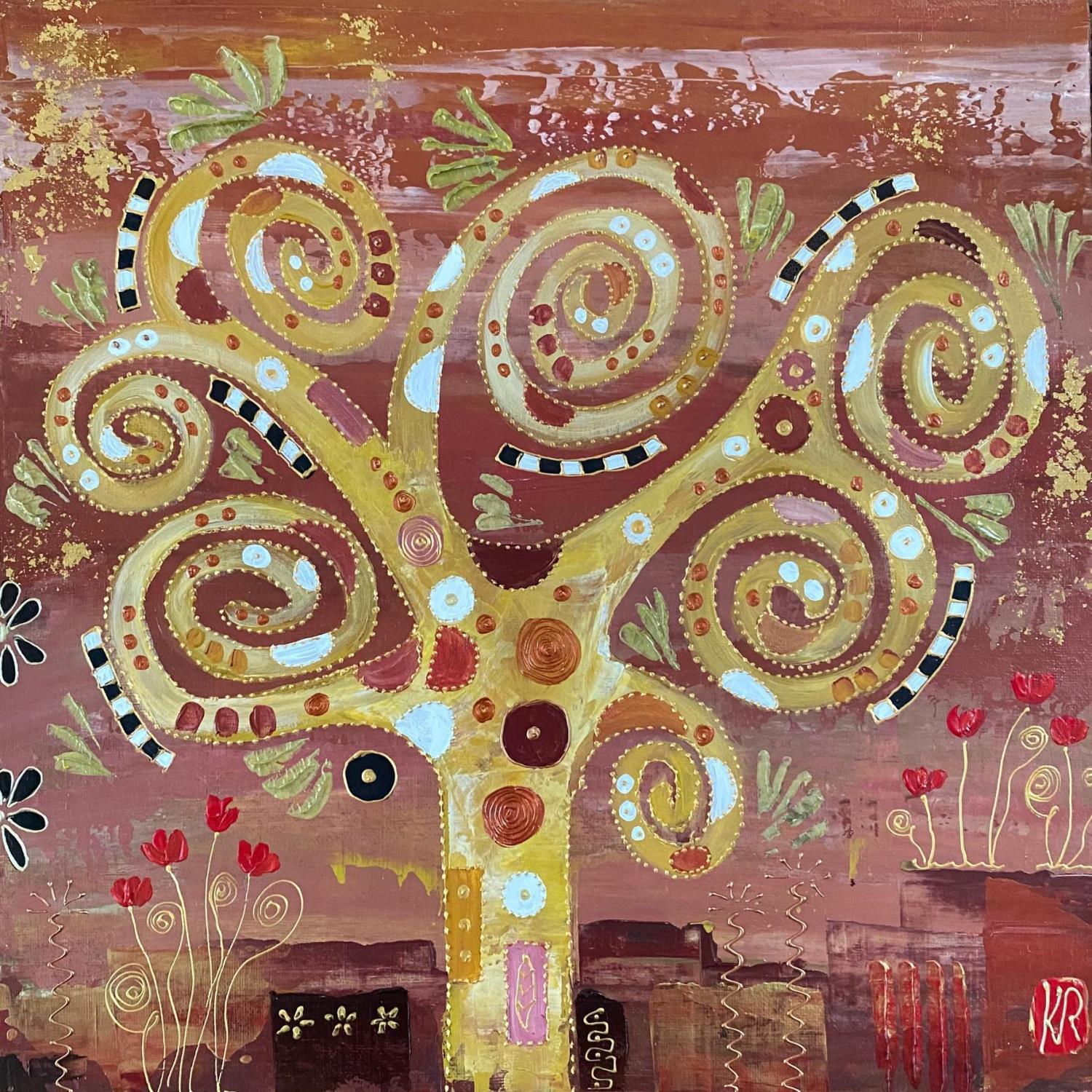 The artist used Acrylic, Gold leaf, Paper, Pastel, Posca media on Canvas board to create this Figurative, Small size painting.