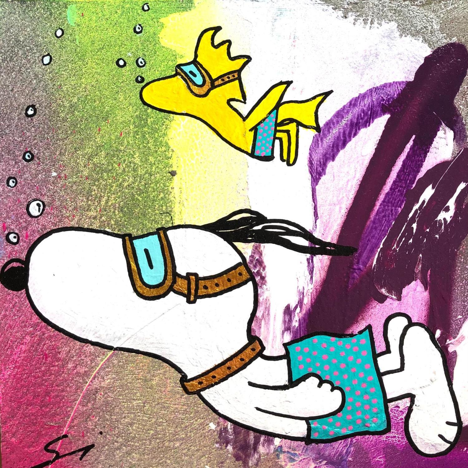 This unique and original contemporary artwork "DIVE INTO ANOTHER WORLD" on the subject of Pop icons has been created by the contemporary artist Mestres Sergi.