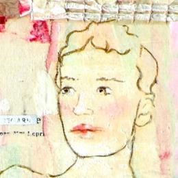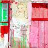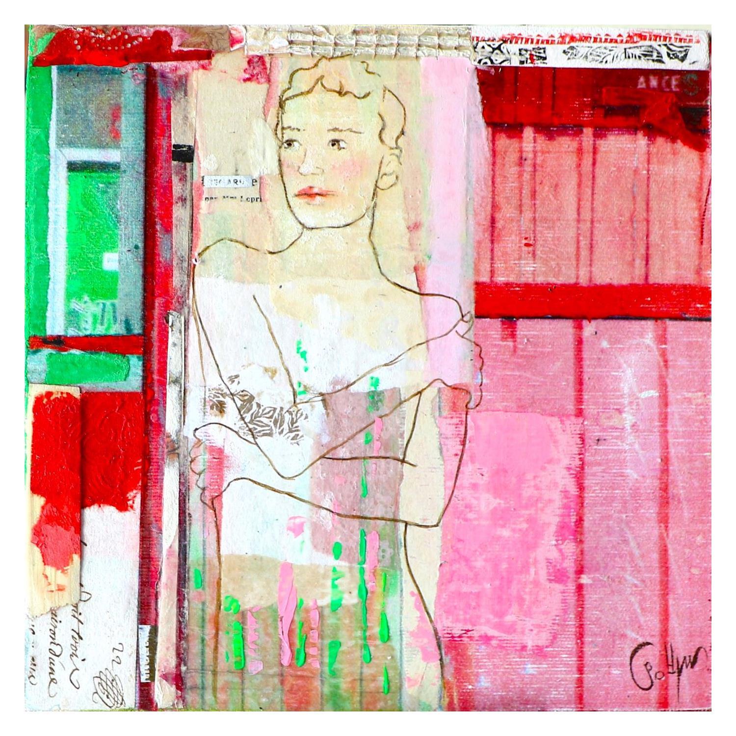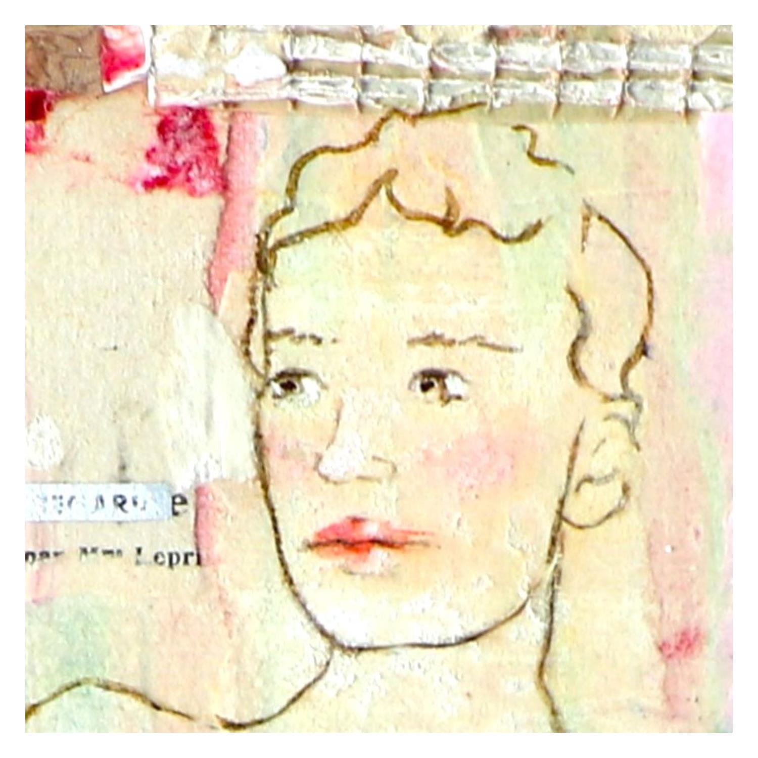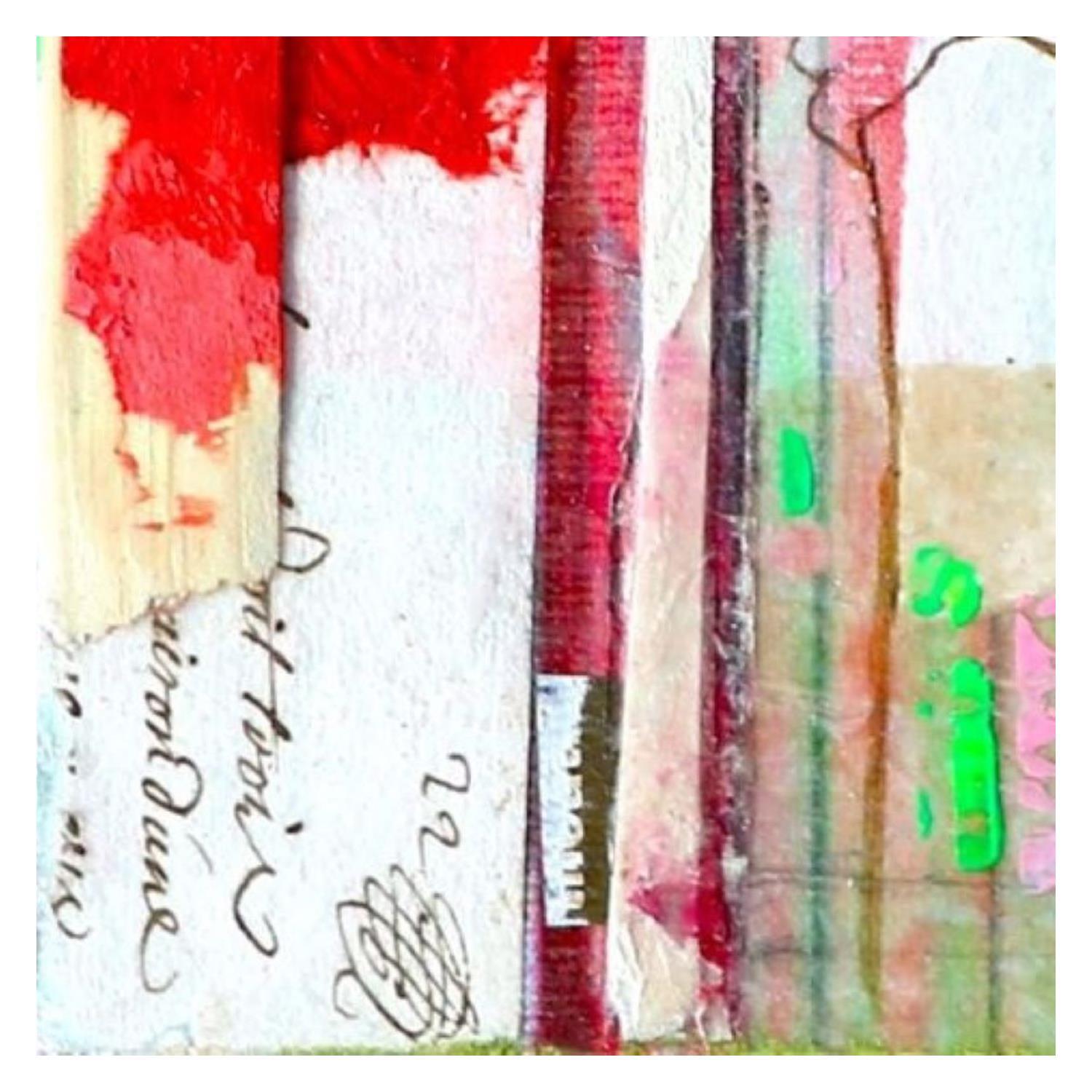 The artist used mixed media, stamping, ink, acrylics, collage art and upcycling to create this small-format canvas-on-wood Singular Art painting on the theme of scenes of life.