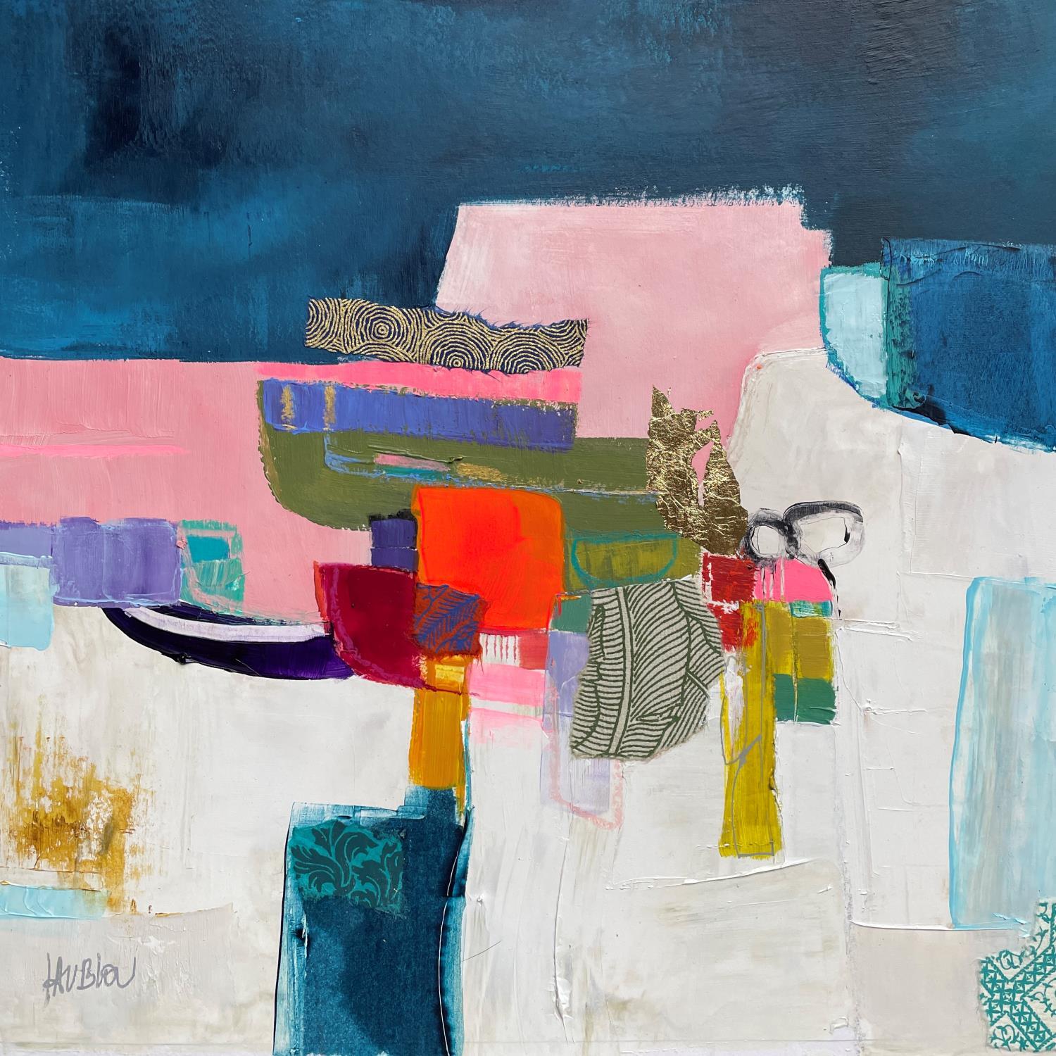 The artist used Acrylic, Gluing, Gold leaf, Paper, Pastel media on Cardboard to create this Abstract, Small size painting.
