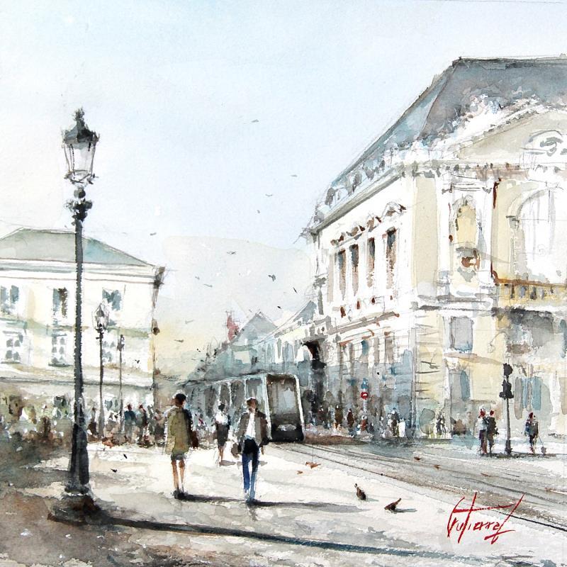 Pintura La place Jean Jaurès por Gutierrez | Pintura Impressionism Urban Watercolor